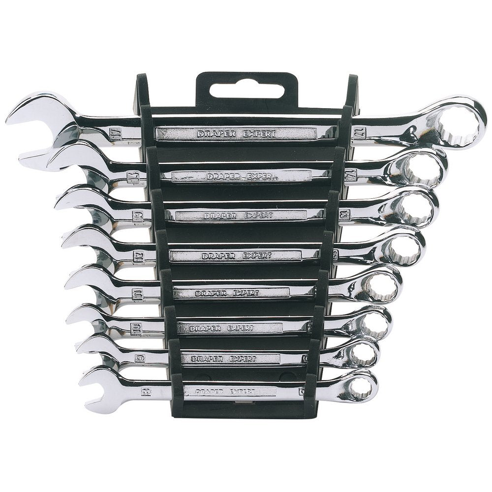 Expert Quality, with Draper Expert HI-TORQ® deep offset pattern ring end. Open end set at 15°. Forged from chrome vanadium steel, hardened, tempered, chrome plated and fully polished throughout. Supplied on wall mountable plastic rack.