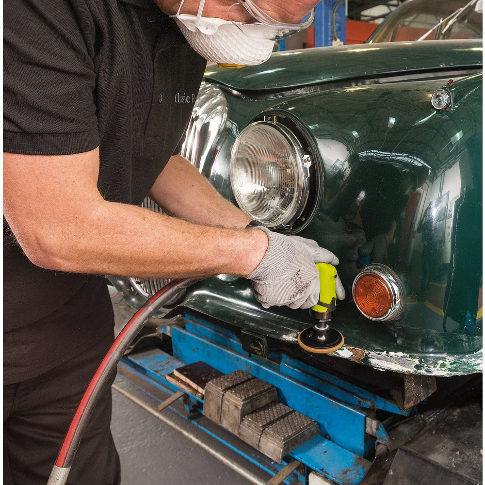 A low noise, low vibration air sander with a high speed mechanism that ensures greater stock removal, ideal for small scale surface repairs and other intricate applications. Manufactured with a casing made from the composite plastic and fitted with a high-tech two speed motor activated by a trigger. The ergonomic design and lightweight housing assist in prevention of the cold-sink effect.