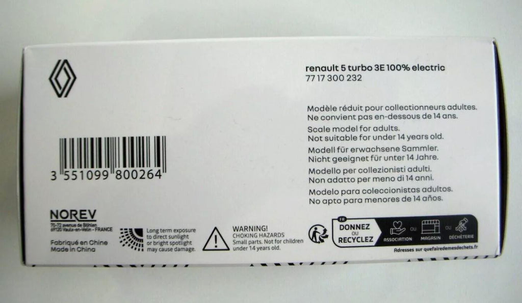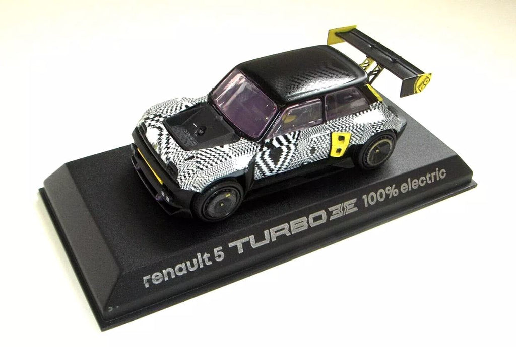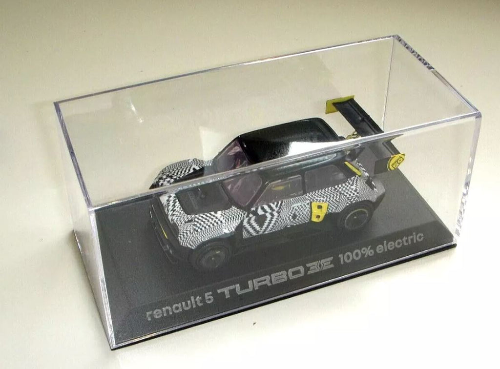 1:43 scale modelScale model of the Renault 5 Turbo 3E Electric placed on a base in a plastic showcase.The model is made of metal and plastic.The model can be unscrewed from the plastic base.New, original model.