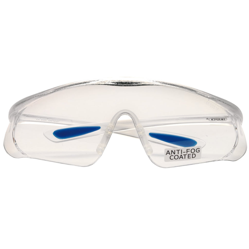 Lightweight safety glasses with clear polycarbonate wrap-around anti-scratch and anti-fog lens. Fitted with a soft rubber nose piece and rubber-tipped arms achieving a secure and comfortable fit.