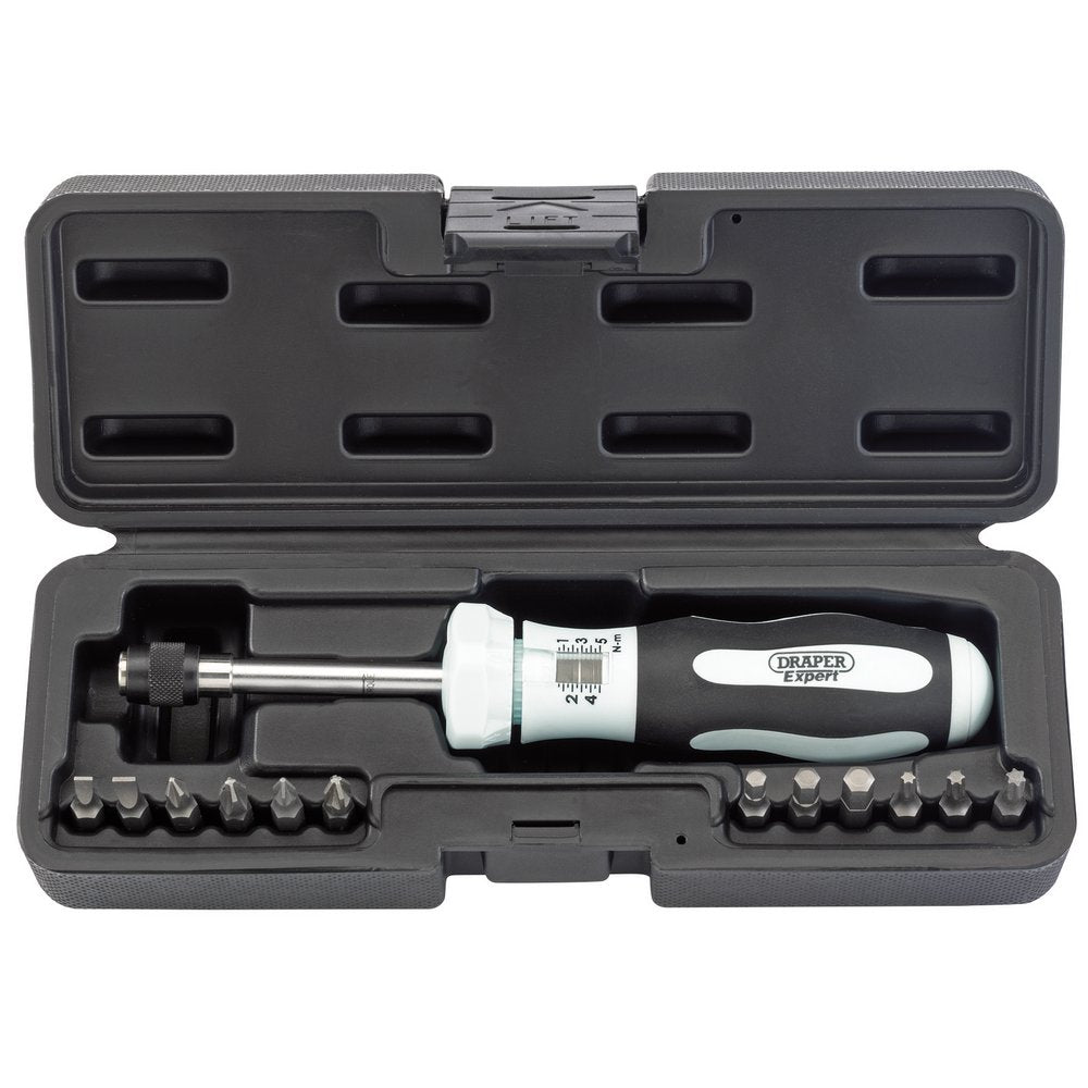 Adjustable torque screwdriver, which provides variable precision torque settings. The torque screwdriver is fitted to a comfortable ergonomic soft grip handle for ensuring the user gets an unsurpassed performance. Its extremely accurate +/-6% measurements are in accordance with the EN ISO 6789 standard. The simple to operate setting control and easy-to-read scale delivers an ingenious screwdriver essential for precise torque setting. Insert bits can be easily and rapidly changed and are stored in the blow moulded storage case for convenience.