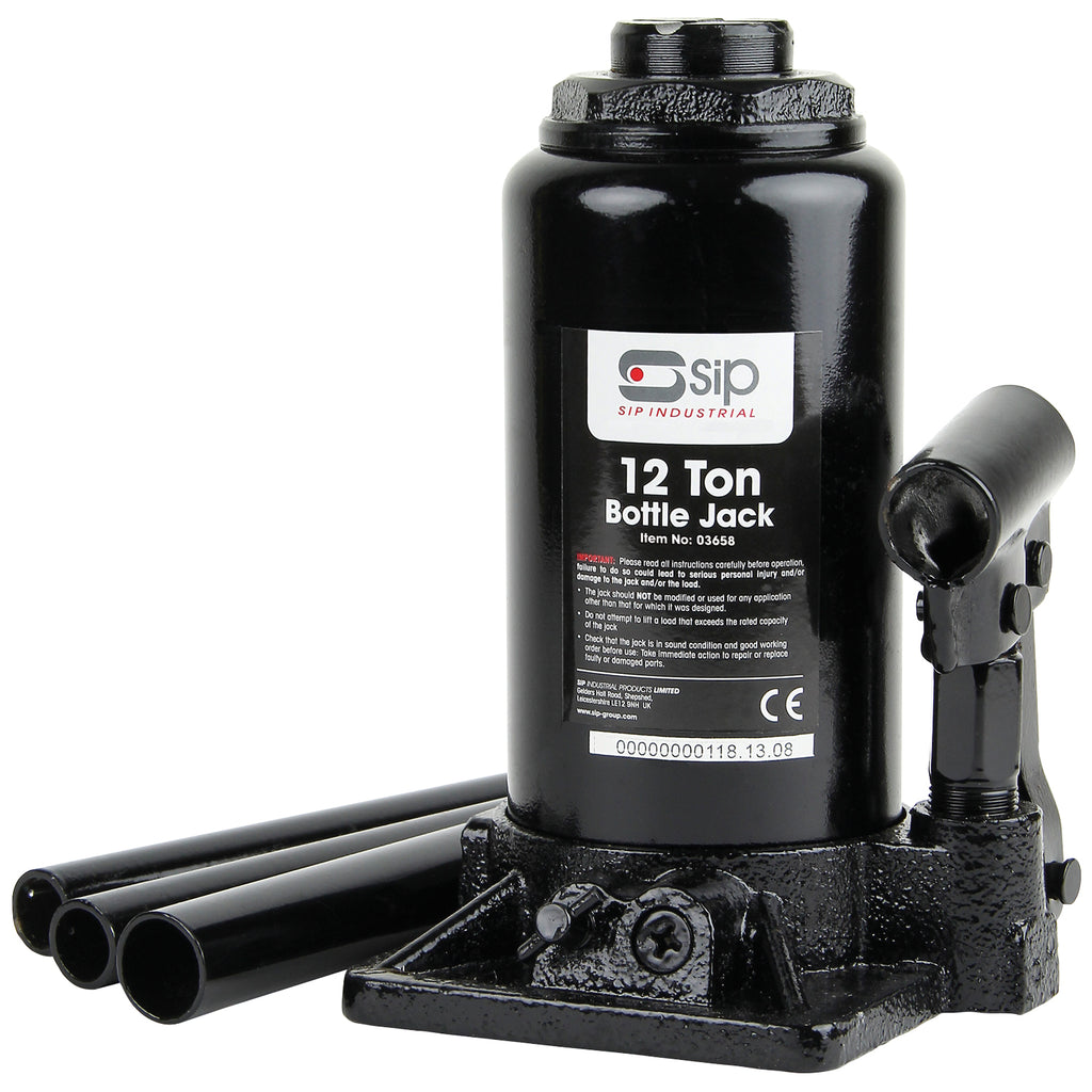 The SIP 12 TON Bottle Jack offers optimal stability and load support to a wide range of vehicle and machinery types, including cars and vans, thanks to a variety of robust and durable components that give heavy-duty and reliable performance.A durable serrated saddle ensures the safest load contact possible. This, coupled with a wide base manufactured from heavy-duty cast iron, means that the jack can offer continued and extremely reliable and powerful lifting performance.The 12 TON Bottle jack is designed with reliable overload protection for reduced risk or damage to the jack, increased user safety and added peace-of-mind.• 12 TON maximum weight capacity• 210mm to 415mm adjustable lifting height• 60mm screw extension for increased versatility• Serrated saddle for safe and secure load contact• Wide base manufactured from heavy-duty cast iron• Overload protection and built-in safety valve• Compact design for reduced physical footprint• Ideal for all garages and workshops• SIP 2-Year Standard Silver Warranty