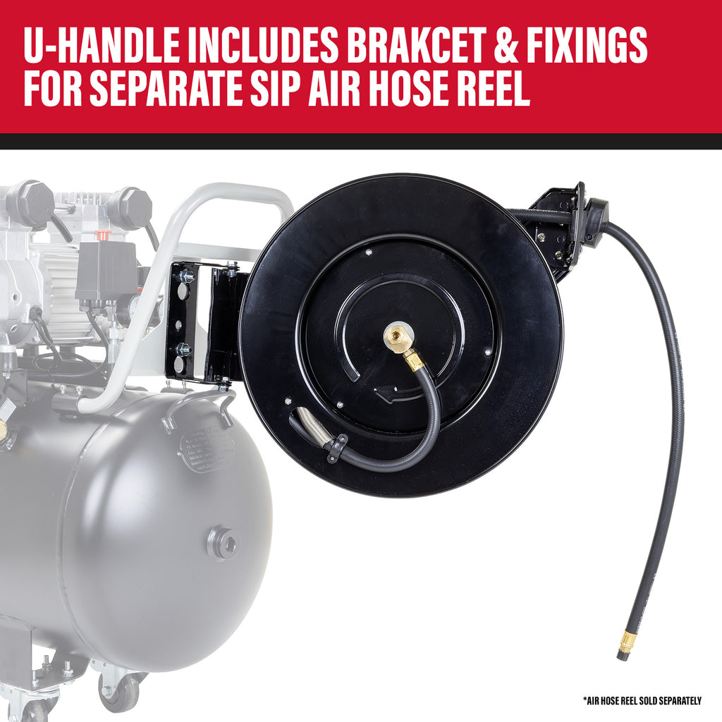 - SUPPLIED U-HANDLE INCLUDES BRACKET & FIXINGS FOR MOUNTING A SEPARATE SIP AIR HOSE REEL: Compatible air hose reels include the 07977 SIP Air Hose Reel R15 (15mtr recoiling hose in heavy-duty metal casing with swivel bracket), 07974 SIP Air Hose Reel 15 (15mtr recoiling hose in heavy-duty plastic casing with swivel bracket) and 07972 SIP Air Hose Reel 12 (12mtr recoiling hose in heavy-duty plastic casing with swivel bracket).