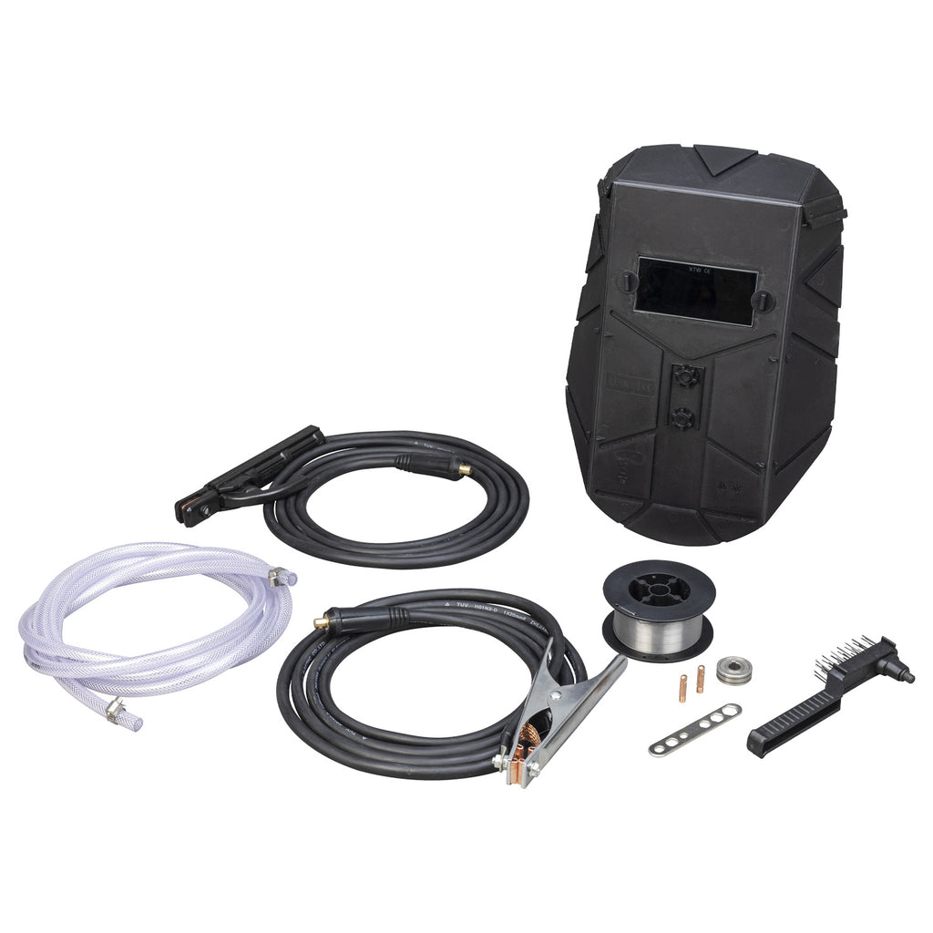 - Accessories included: Supplied with integrated 2mtr MIG torch, electrode lead, earth lead, gas hose with clamps, 0.7kg flux-cored wire reel, feed rollers, contact tips, chipping hammer/brush and face shield.