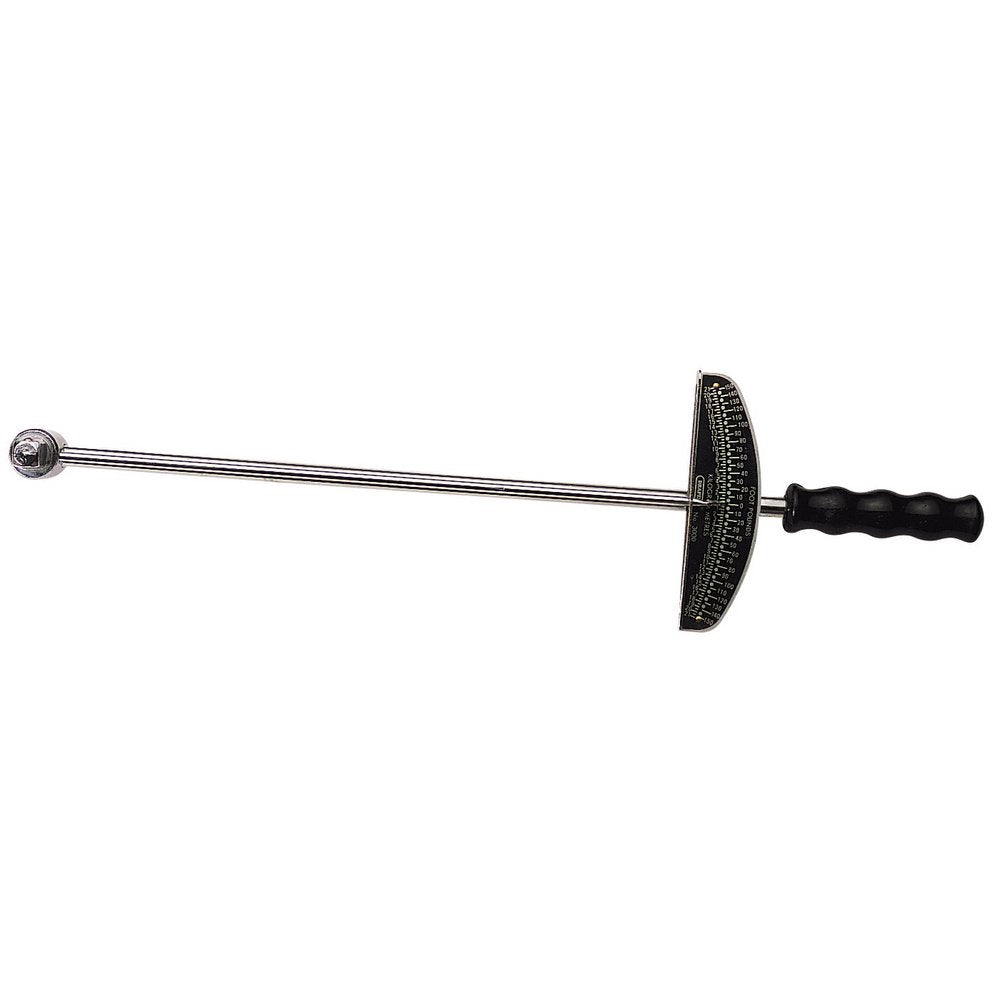 Dual scale forward/reverse operations. Wrench uses the deflection of the main spring beam to measure torque applied. The scale is graduated M/kg and lb - ft in two directions. Overall length 460mm.