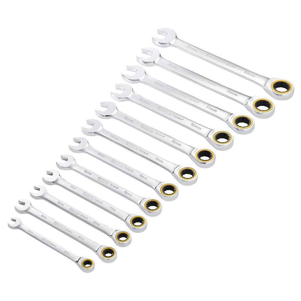 This 12-piece Draper Expert HI-TORQ® metric reversible ratchet combination spanner set is manufactured from hardened and tempered chrome vanadium steel, with a mirror chrome plate finish for corrosion protection. The 100-tooth ratchet enables 3.6° movement and the open end is set at 15°, making the spanners ideal for use where there’s limited space. The ring end is 12-point , providing a superior grip; with Draper Expert HI-TORQ®, the spanners grip the flats of the fastener rather than the corners. This gives more grip while transmitting more torque to the nut or bolt and prevents damage to the corners by spreading the load across the flats. The set comes supplied in a useful storage/carry rack.