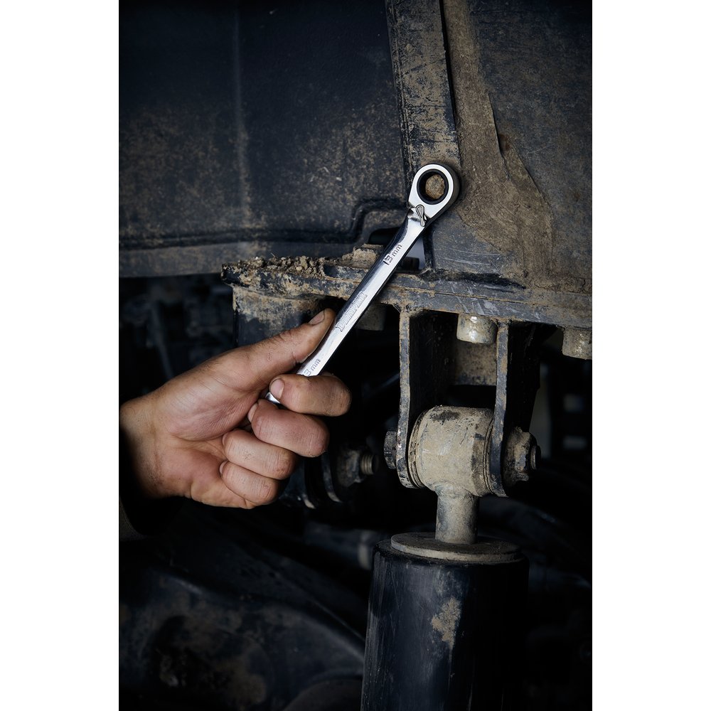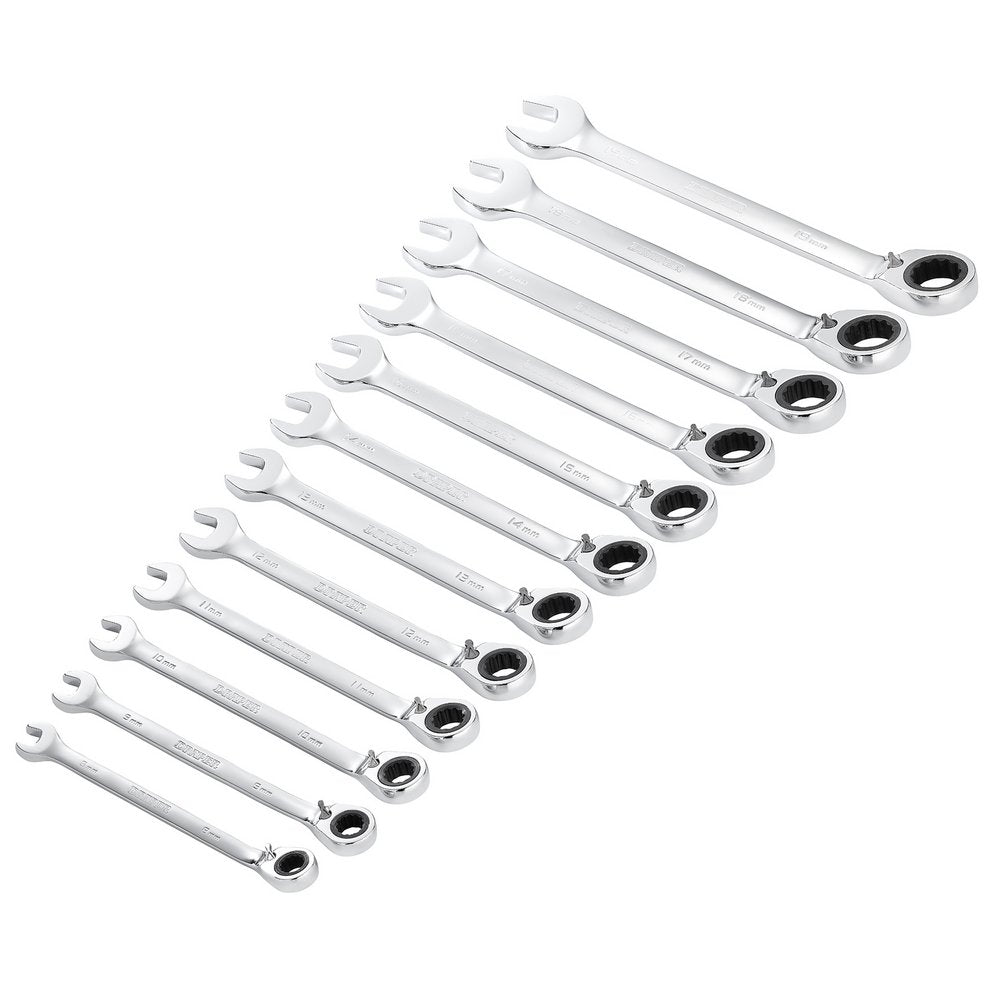 These Draper HI-TORQ® metric reversible ratchet combination spanners are forged from chrome vanadium steel that is hardened, tempered, fully polished and mirror chrome plated for corrosion protection. The open end is offset at 15°. The ring end has a 15° cranked head which incorporates a 90-tooth ratchet mechanism allowing 4° movement, enabling use in tight spaces. There is also a forward and reverse direction lever on the ring end. The 12-point HI-TORQ® delivers maximum leverage by transferring torque to the flats and preventing slipping or damage to the fastener. This 12-piece set contains the full range.