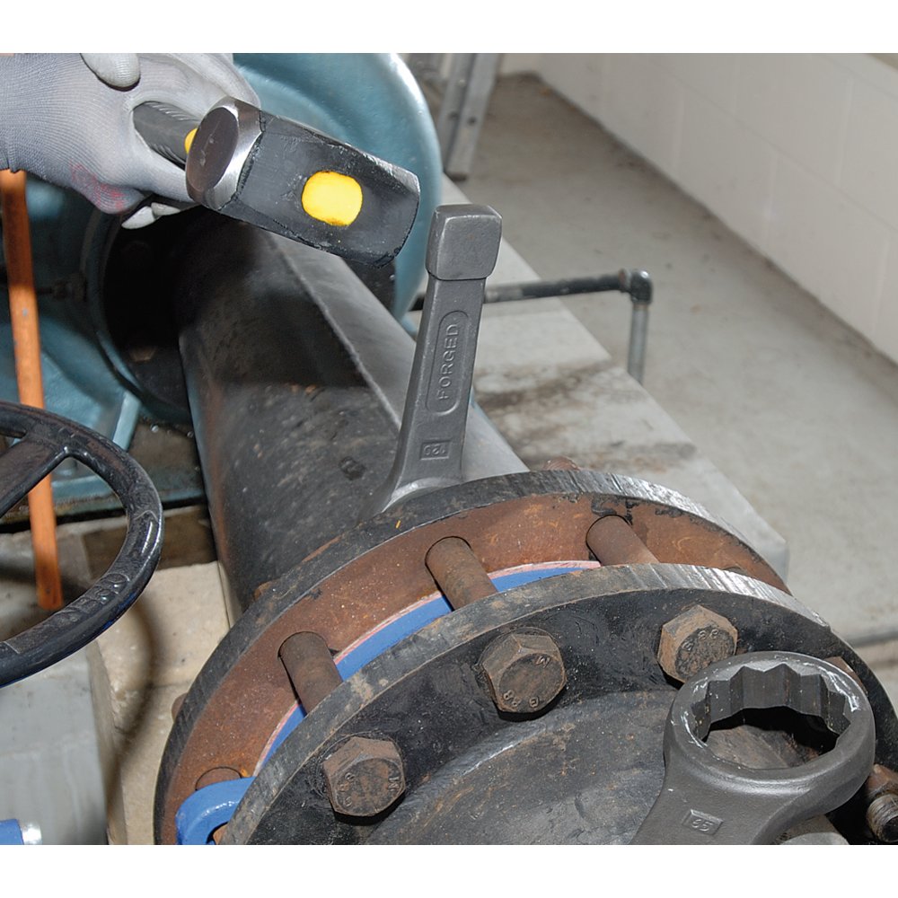 Flat pattern spanners with striking end. Forged from good quality carbon steel, hardened, tempered with black phosphate finish. Length +/ - 5mm.