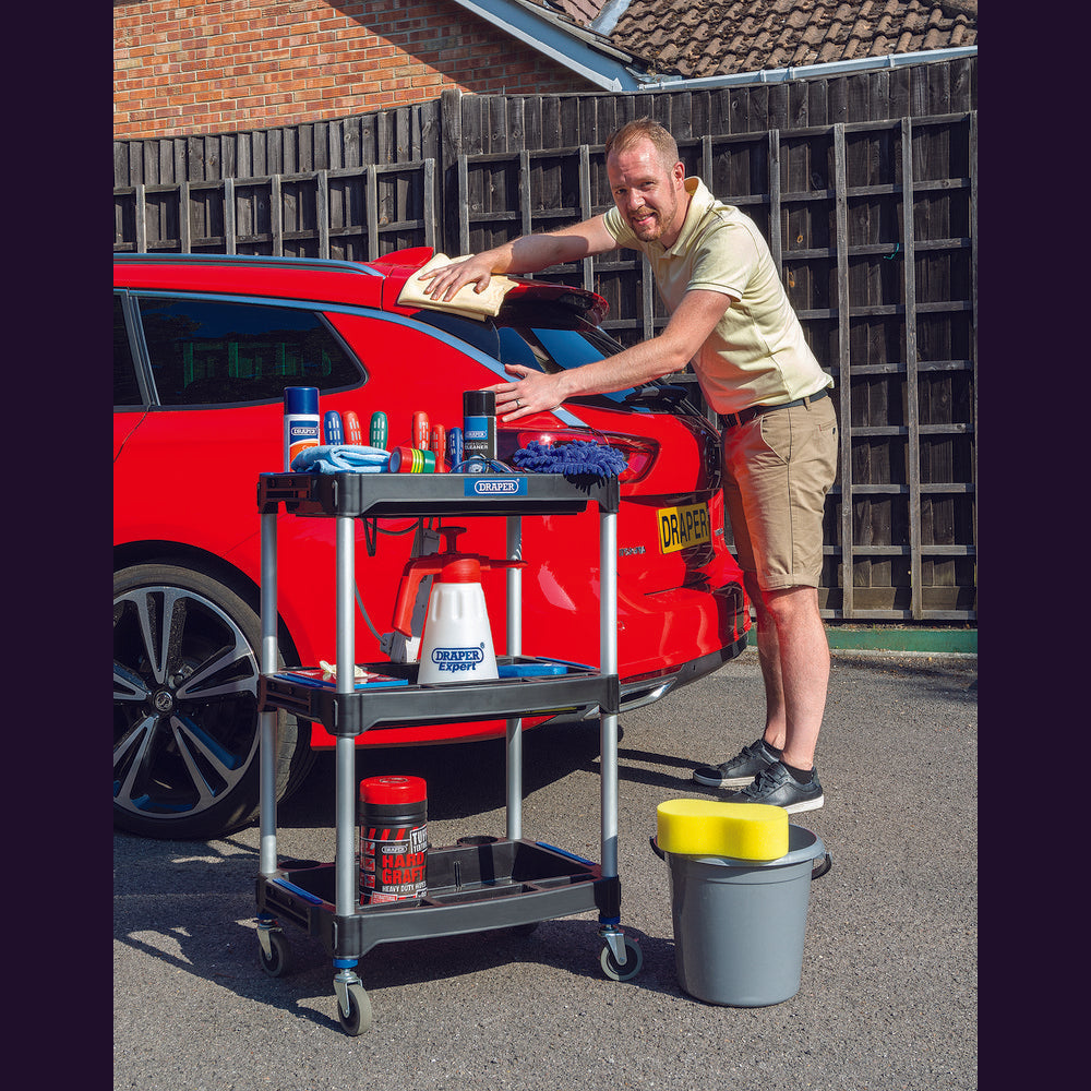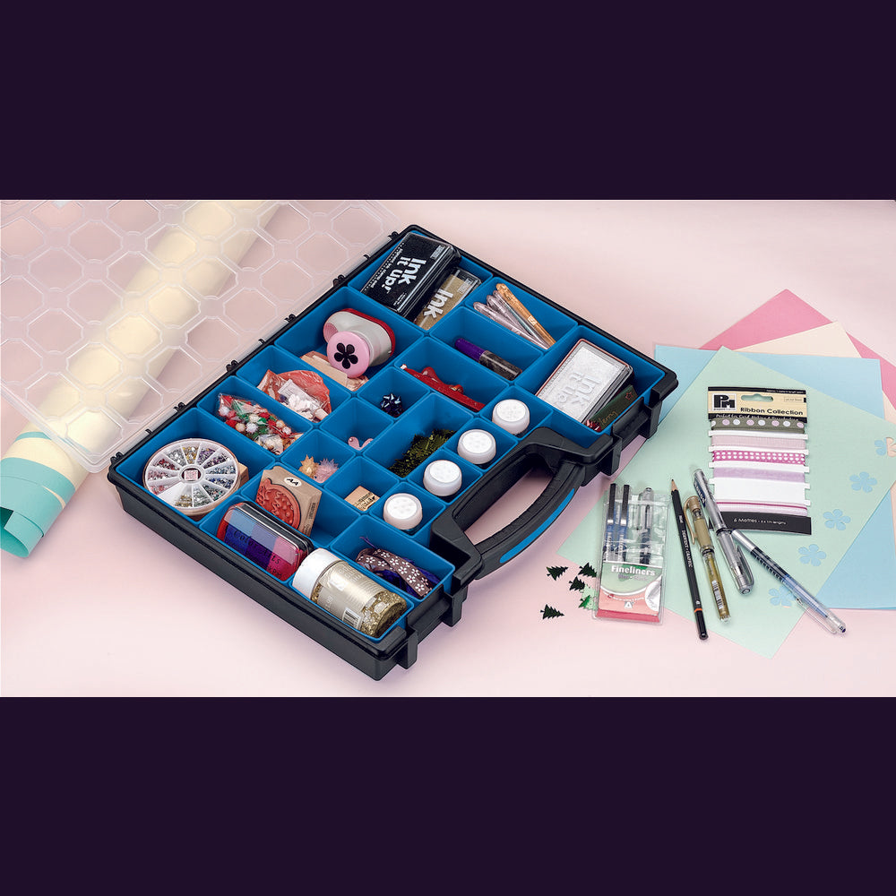 Plastic organiser with an adjustable matrix of lift - out storage compartments. Case has a carrying handle with 'snap fit' closures and clear lid.