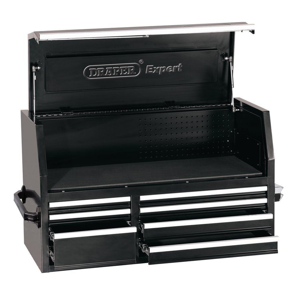Expert Quality, seven drawer top tool chest. Manufactured from thick sheet steel with a protective powder coated finish. Drawers are fitted with an aluminium trim, 3mm EVA foam linings, heavy duty auto retention ball bearing runners delivering a smoother operation and a secure locking system Supplied with two keys. The reinforced lid is fitted with supportive gas struts and two soft grip handles. Each tool chest is also Supplied with a 6mm EVA top mat on pallet.