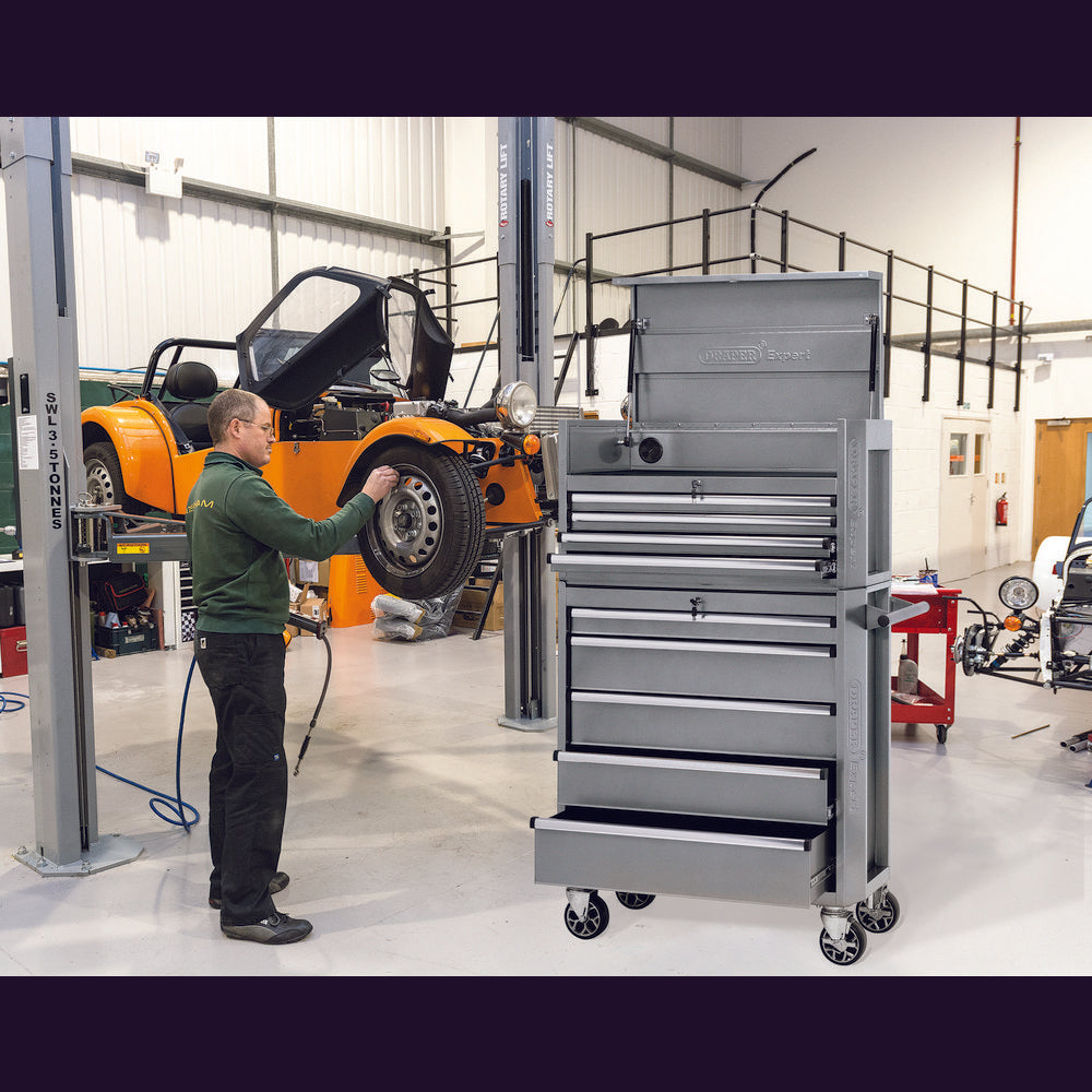 Expert Quality, ten drawer metallic silver combined roller cabinet and tool chest. Attached with braked and swivelling castors and soft grip pulling handles for easy manoeuvrability. The reinforced lid is fitted with supportive gas struts andacable access hole.Manufactured from thick sheet steel with a protective powder coated finish. Drawers are fitted with aluminium trim, 3mm EVA foam linings, secure locking system with two keys and auto retention ball bearing runners delivering smoother operation. Each tool cabinet is also Supplied with an EVA top mat on a pallet.