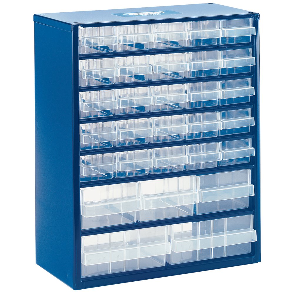 - Steel framed organiser ideal for use in the home or workshop with 30 tough polypropylene drawers