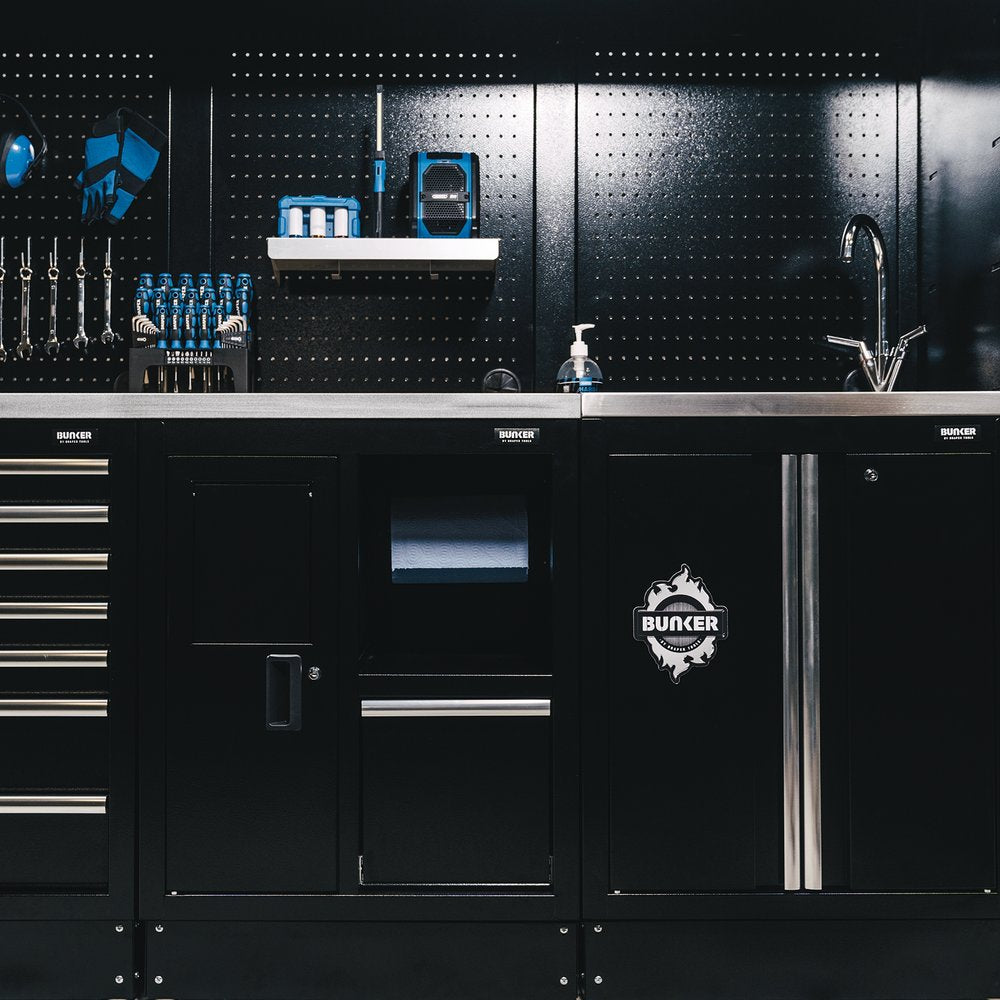 Part of the BUNKER® modular storage system. This stunningly designed premium-quality steel back panel is a great storage solution designed to keep tools on display and even more accessible when you need them. The matt black textured finish is highly durable, thanks to the industrial powder coating that protects against scratches, wear and corrosion. This pegboard can be used to connect wall cabinets to floor cabinets when used in conjunction with the side wall bracket. The panel has one pre-cut defined hole intended for passing a plug through for connection to a power supply. It measures W 602 x H 1,081 x D 24mm and can be used individually or as part of the BUNKER® modular storage system, which includes 24 clever modular options. It comes supplied with all the required fittings for simple installation. For your quality assurance, all BUNKER® units include a 10-year warranty.
