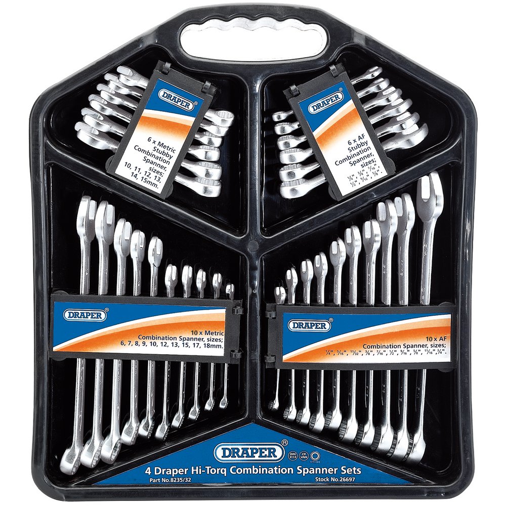 Four sets in one comprehensive package-two metric sets and two AF sets. Forged from chrome vanadium steel hardened, tempered and chrome plated for corrosion protection. Polished Draper HI-TORQ® ring end offset at 15°. Jaw offset at 15°. Supplied in wall mountable plastic storage rack.