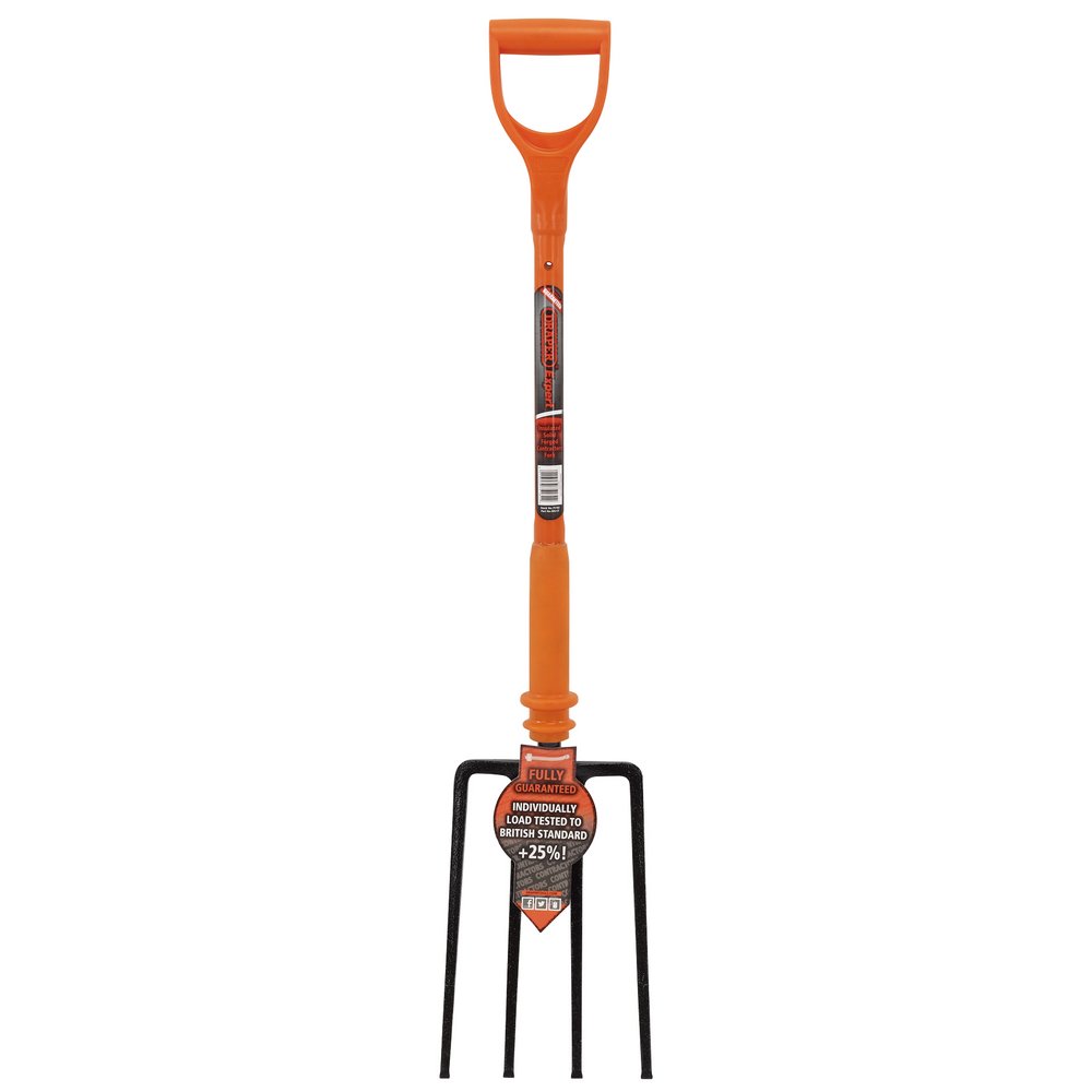 Fully insulated fork designed for working near live cable and wires. Individually tested to 10,000V, guaranteeing safe working on 1,000V and complying to the BS 8020 standards. Manufactured with an epoxy fibreglass core and attached to a fully enclosed insulated shaft with hand slip guard. The four extra strong prongs on the head are attached to a fully enclosed insulated shaft with hand slip guard. Each fork is Supplied with a certificate of conformity, which correlates with a unique traceability number embossed on the shaft.