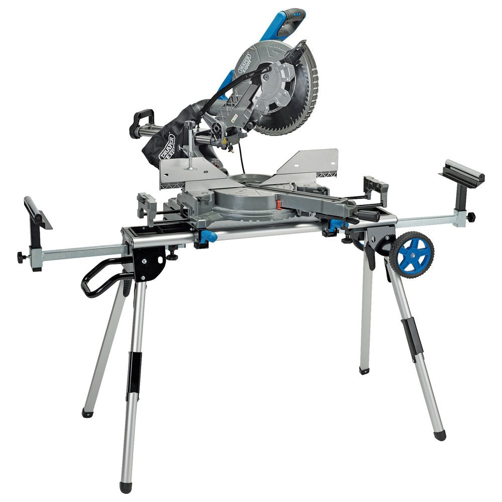 Universal extending mitre saw stand with height-adjustable work-support rollers enabling use with timbers over 2M in length. Made from lightweight steel and aluminium that's fitted with an extendable galvanized beam, fully adjustable end rollers and quick - action locking levers for securely bracing the mitre saw in place. The round aluminium folding legs and sturdy wheels deliver ease of storage and transportation even with a mitre saw locked in situ. Equipped with a handy tool tray and a mesh bottom to store and 'catch' small tools. Compatible with most makes of mitre saws.