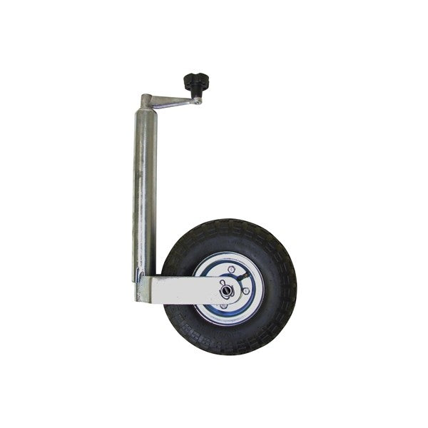 This Maypole Pneumatic Jockey Wheel is a Heavy Duty Telescopic jockey wheel which has been Zinc plated. The zinc plating ensures that weather will not start to corrode and affect the strength of the wheel and steel pole. With a 48mm diameter tube, with a 260mm steel wheel, the maximum nose weight guide is 200kg. There is also a split clamp included with the jockey wheel.