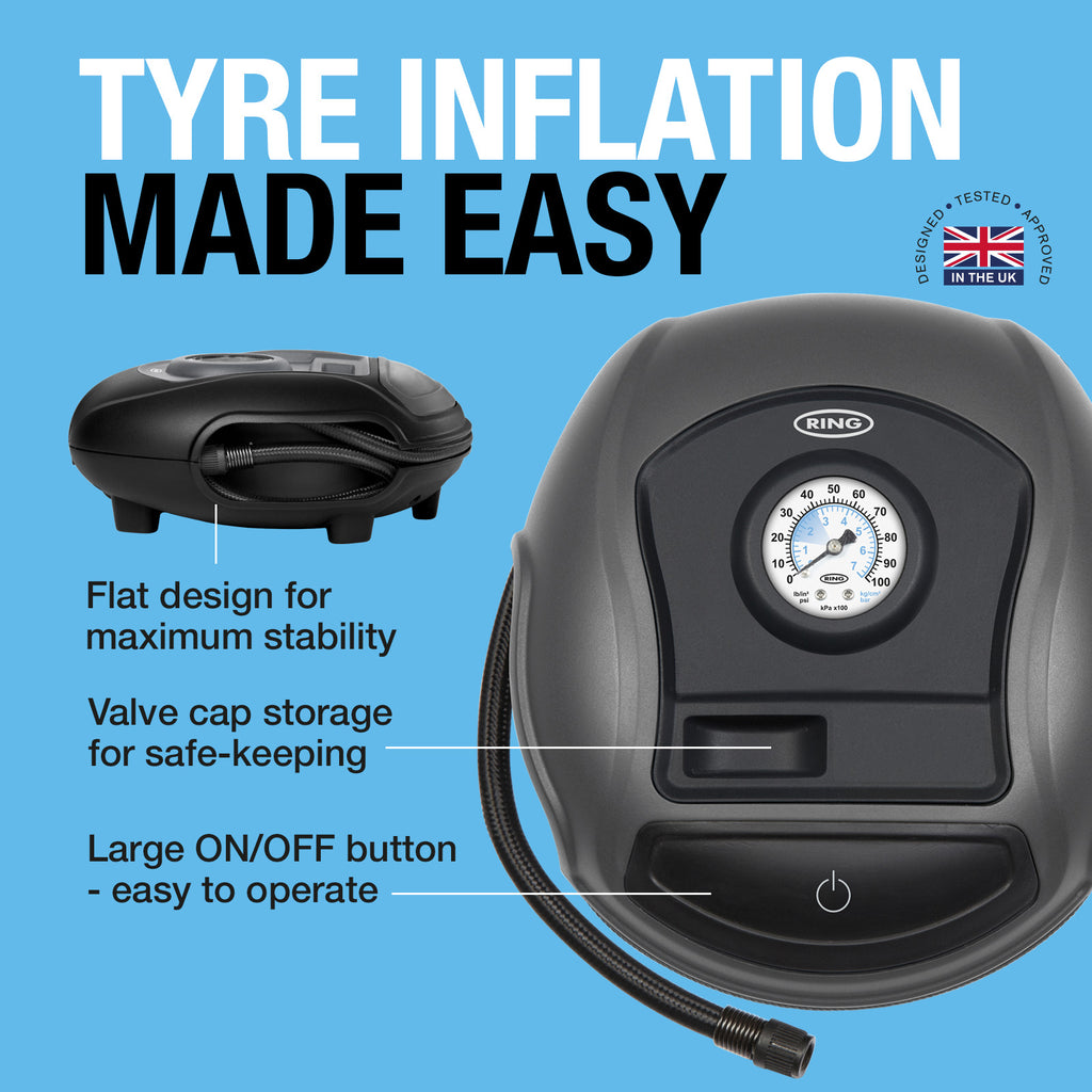 RTC100 analogue tyre inflator. Easy to use tyre pump with dial. Large on/off button makes operation simple. Stable design keeps the inflator stable during use.