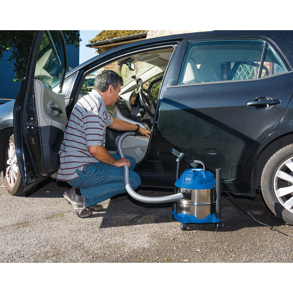Designed to pick up wet and dry materials with a 15L tank volume and blower function. Ideally suited for use in the workshop, garage or DIY work around the home and garden. 5m (approx.) cable and approved plug. Fitted with on-board tool storage facility, castors for easy movability and a carry handle.