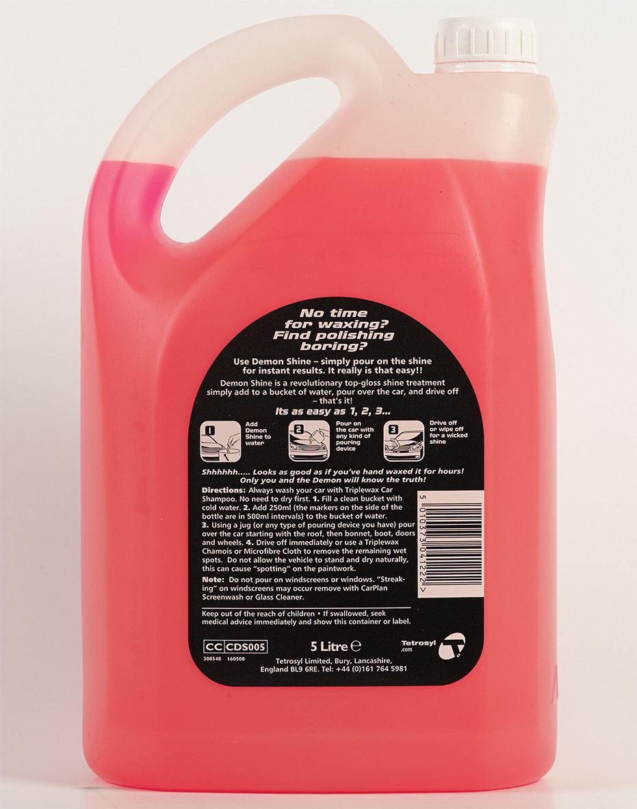 No time for waxingFind polishing boringUse Demon Shine - simply spray on the shine for a wicked shine - it's that easy! CarPlan Demon Shine is a revolutionary top-gloss shine treatment simply add to a bucket of water, pour over the car, and drive off - that's it!