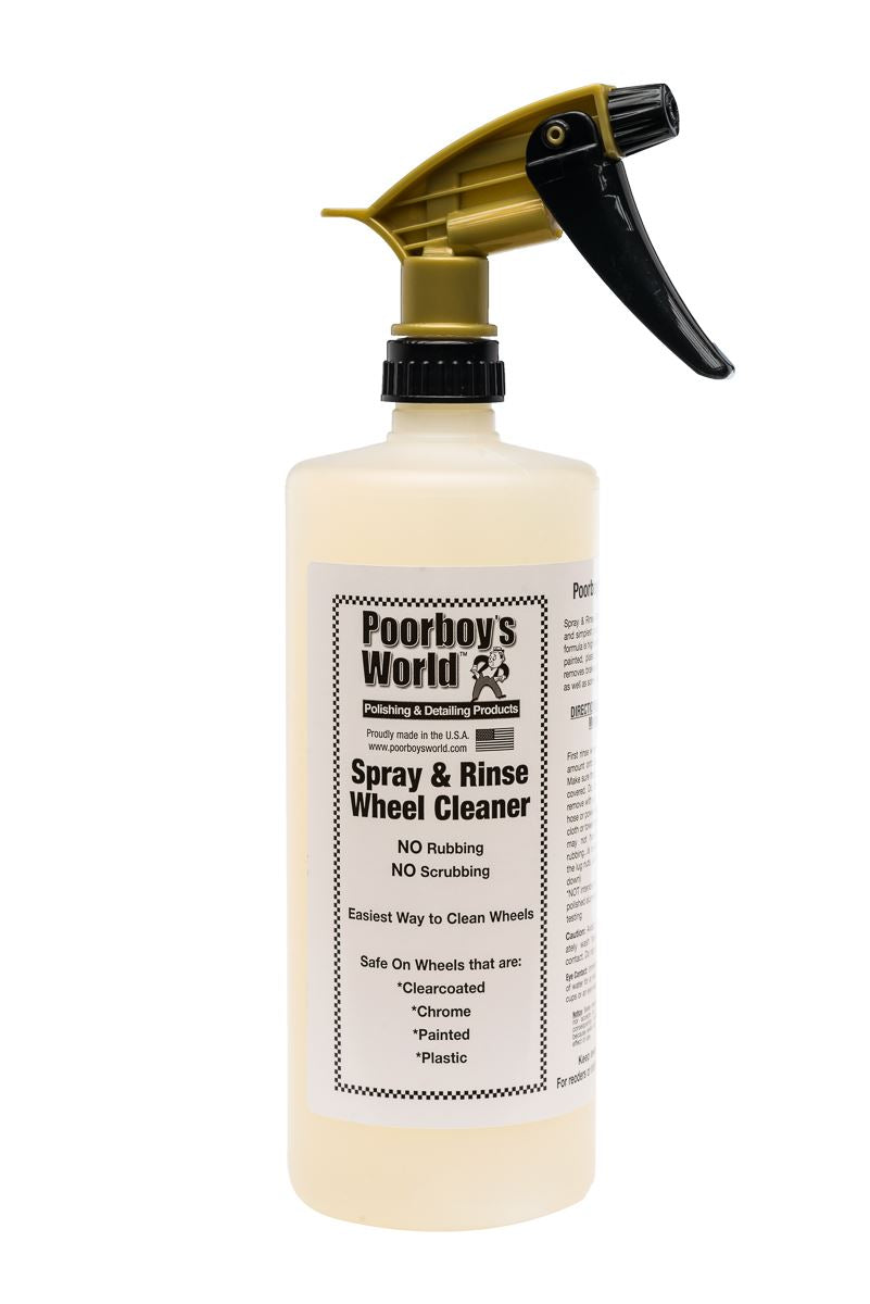 Poorboy�s Spray and Rinse Wheel Cleaner is an aggressive citrus cleaner. The scent is pleasant, though a little strong, so use Poorboy�s in a well-ventilated area. Just spray it on your wheels, taking extra care to thoroughly cover your entire wheel. Spray on all four wheels before you start rinsing it off. Use a steady stream of water to rinse your wheels completely clean. Poorboy�s will leave no residue. If you want, spray the inside of the wheels, too. Poorboy�s will only work where you put it so be sure to spray around the wheel nuts and between spokes.. requires no rubbing or scrubbing. Powerful enough to break up brake dust and road grime without any agitation. Spray on, rinse off. Use it on all clearcoated, chrome, painted, and plastic wheels.. .