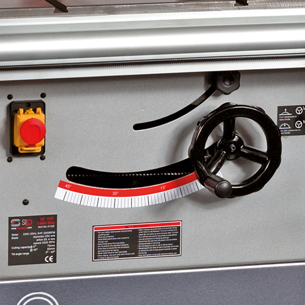 Having a powerful table saw in the arsenal is essential for all woodworking workshops, providing a versatility unmatched by most. The SIP 10" Professional Cast Iron Table Saw gives you exceptional performance regardless of the cut, whether ripping, cross cutting, miter, bevelling, or preparing a wood sheet.This is made easy not only by the power of the saw and the high-quality blade within, but the large working surface that the saw offers, with a table and 2 extensions to amount to a 1170mm x 800mm total area, perfect for timber, logs, and more of all sizes.• 53mm @ 45° and 75mm @ 90° maximum depth of cut• 10" TCT rise and fall blade with lock for fine precision• Powerful induction motor provides heavy-duty performance• Fitted with an accurate 0° to 45° arbor with blade lock• 560mm x 800mm standard table size for a large area for all wood sizes, which can be enhanced through two supplied extensions for total of 1170mm x 800mm• T-slotted heavy-duty cast iron mitre guide and push stick• Quick adjustment rip fence with Quick-Lock micro adjustment• Heavy-duty cabinet stand included for improved stability• Optional wheel kit available; sold separately• Integrated NVR switch for added safety• SIP 2-Year Standard Silver Warranty