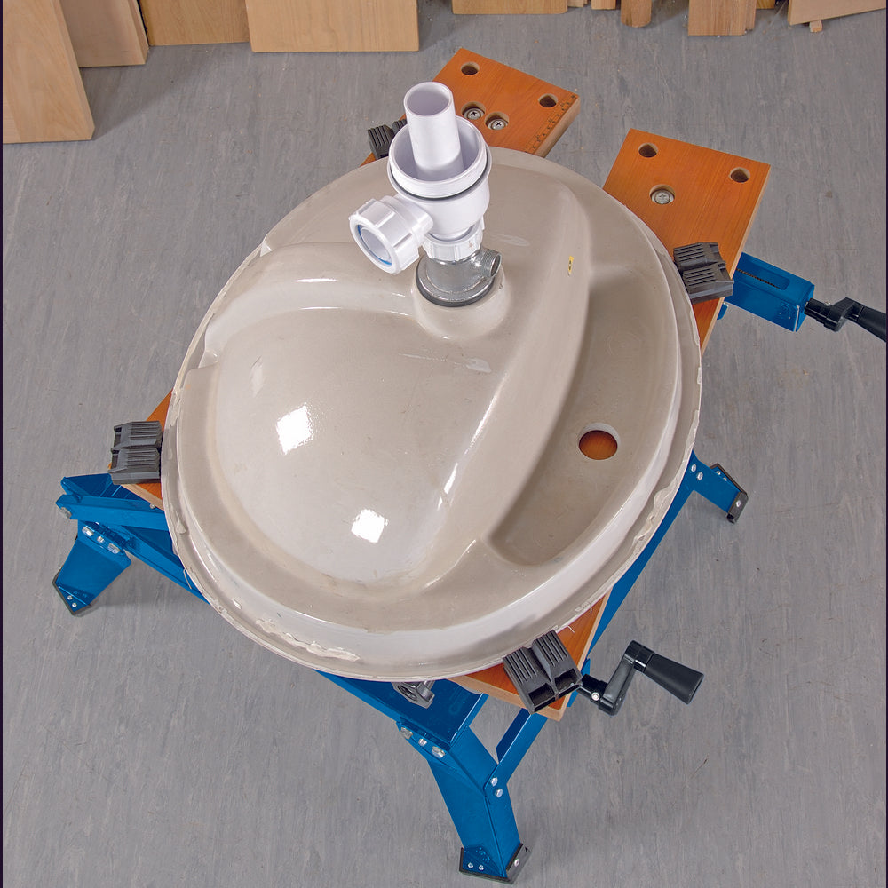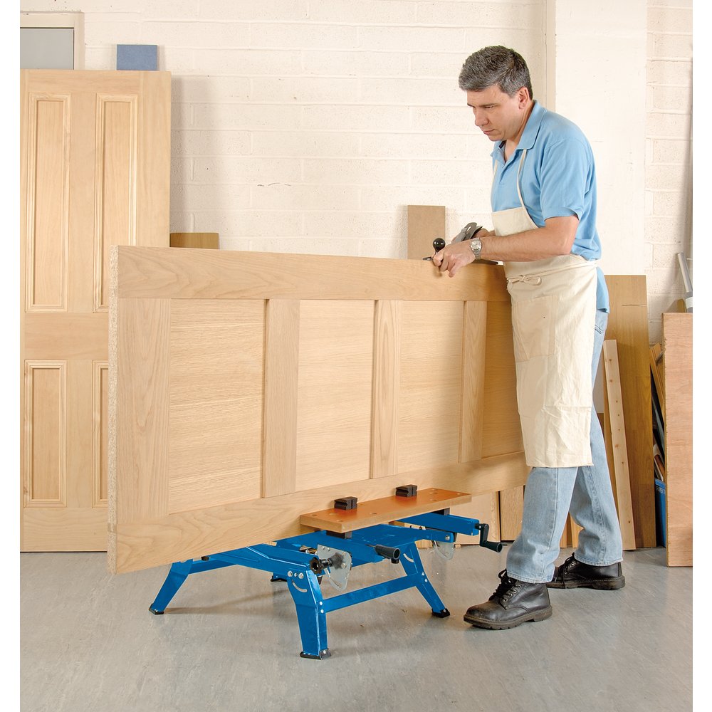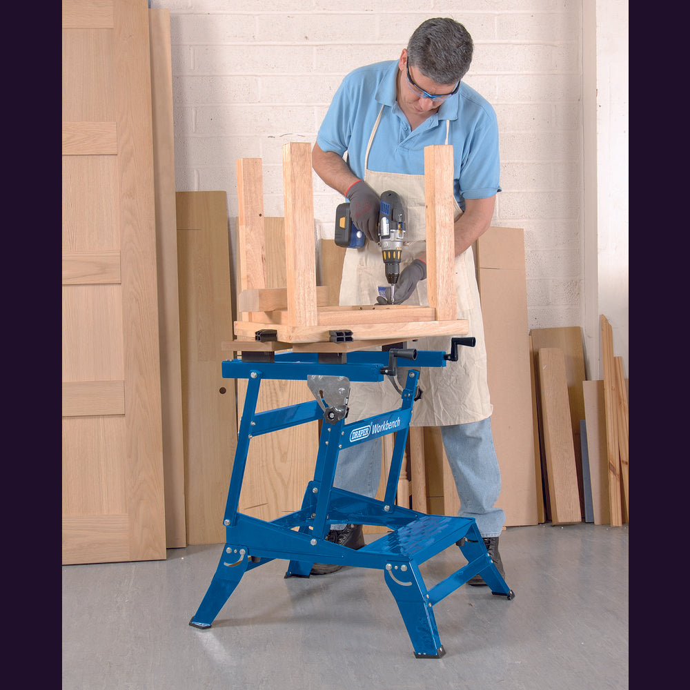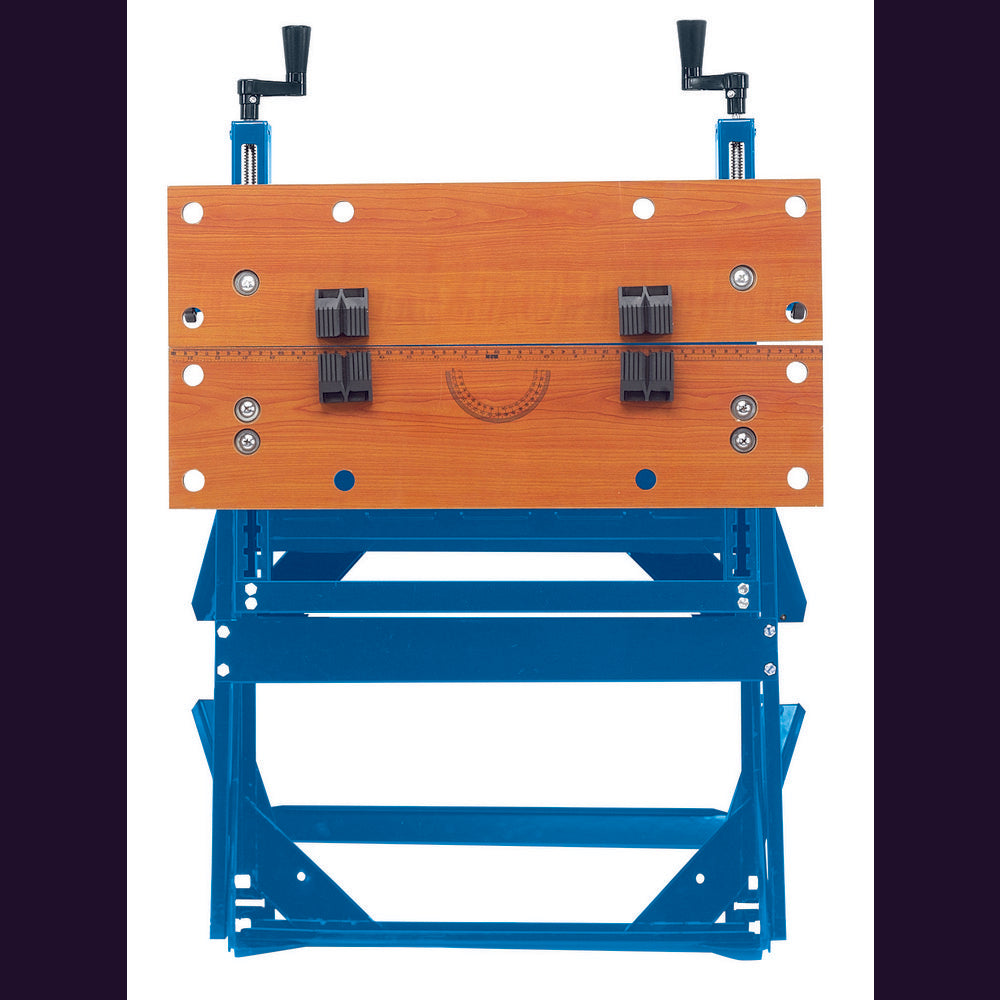 Heavy duty professional workbench with twin height settings for user convenience. Manufactured with two - piece MDF worktop, with quick release jaw function, angled steel legs and anti slip feet, dual clamping action and 12 clamping dog holes. Maximum clamping width with clamping dogs of 380mm, Supplied with four plastic clamping dogs. Easily folds away for secure storage and portability. Weight 13kg (approx.). Flat packed with assembly instructions.