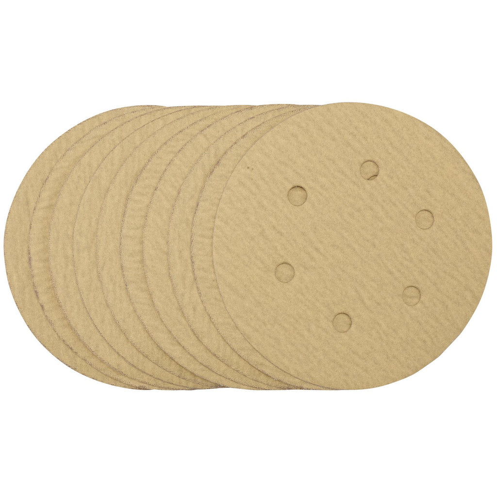 This pack of 10 gold sanding discs are made from aluminium oxide with a special treatment of calcium stearate which is resin bonded to provide self-sharpening and anti-clogging performance. The heavy duty D-Weight backing paper makes the sanding disc more durable - able to withstand the toughest jobs. The hook and loop backing offers decent adhesion to facilitate the fast changing of sanding discs. The six pre-punched 8mm holes improve the dust extraction during sanding. Ideal for sanding and finishing wood, metals - including ferrous alloys, painted surfaces, varnish, plastic and fillers. Compatible with all 150mm random orbit sanders with a hook and loop backing pad, including Draper Stock No. 65084, 83942 and 84125.