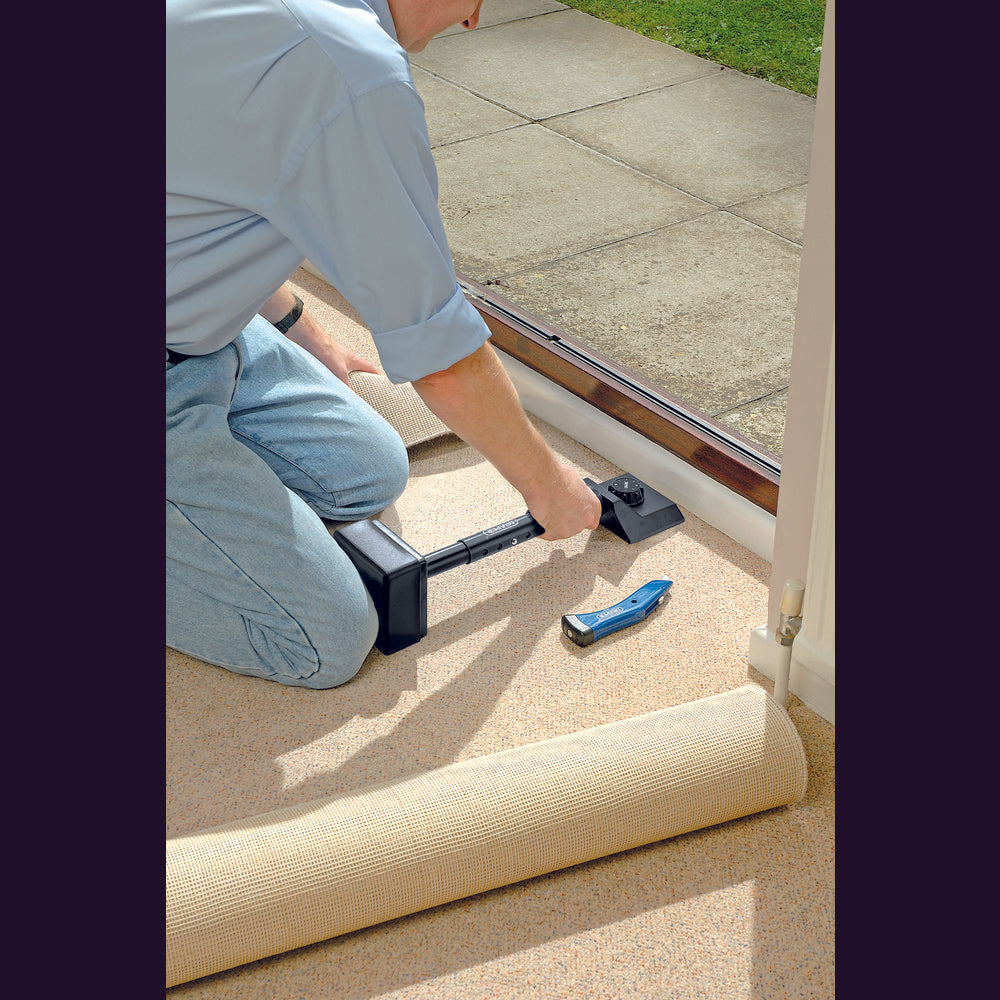 Five stage adjustable length knee kicker with variable height pins for gripping the carpet when stretching. Soft rubber kneepad gives comfort when 'kicking' carpet up to the skirting board.