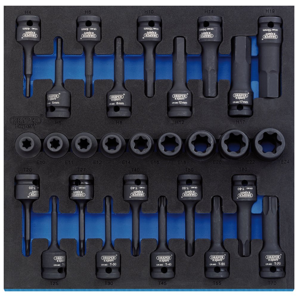Items manufactured from chrome molybdenum steel, which is correctly hardened and tempered with a black phosphate finish. Supplied complete in a two tone 1/2 drawer EVA insert tray made from closed cell foam, overall size 270 x 276 x 30mm (w x d x h). Suitable to be used in Draper and Draper Expert tool chests and other manufacturers similar tool chests.