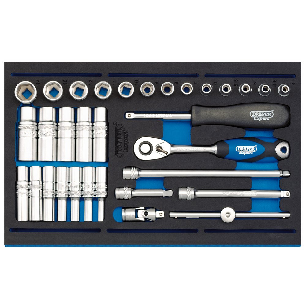 Expert Quality, socket are manufactured from chrome vanadium steel, which is correctly hardened and tempered with a micro satin chrome plated finish. Each socket has a knurled ring for extra grip. Supplied with 72 tooth reversible soft grip ratchet and accessories. Supplied complete in a two tone 1/4 drawer EVA insert tray made from closed cell foam. Suitable to be used in Draper and Draper Expert tool chests and other manufacturers similar tool chests.
