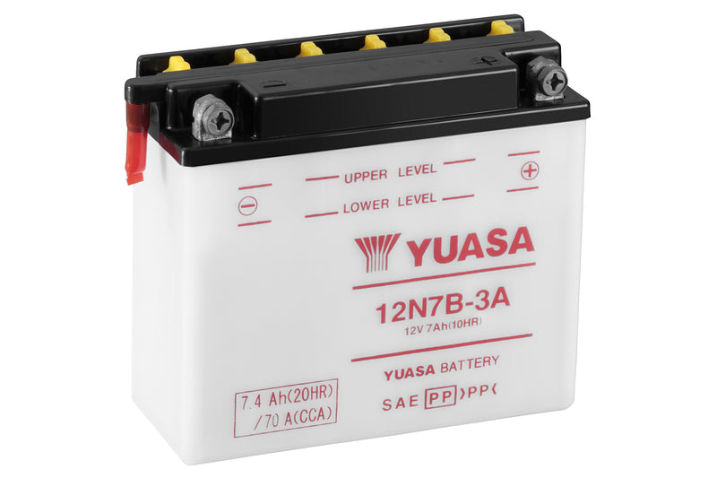 Yuasa 12N7B-3A 12V Conventional BatteryA rugged, dependable battery engineered to withstand vibration and deliver reliable cranking power. The Conventional 12 Volt battery is the industry standard for motorcycles, snowmobiles and ride-on mowers.