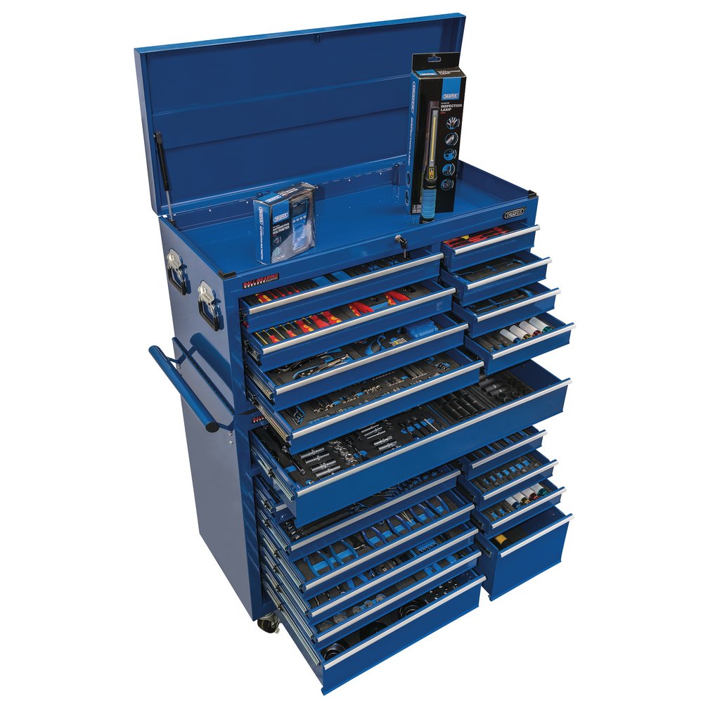 A super tough, powder coated 8 drawer tool chest and 11 drawer roller cabinet.Packed with 700 tool pieces, stored in high quality EVA foam trays. Included with the MegaKit is a slimline COB LED inspection lamp.