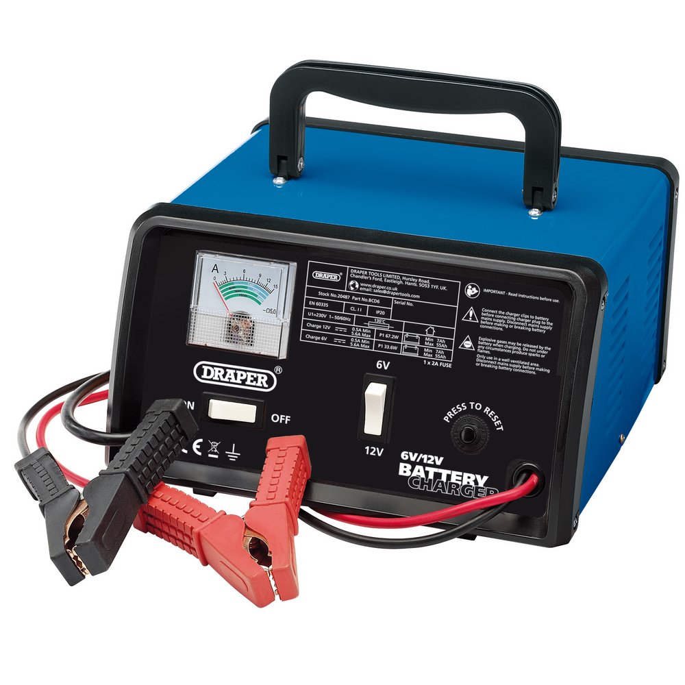 For workshop and home use. Suitable for conventional lead acid batteries up to 55Ah. Integral carrying handle, insulated copper leads and battery clips.