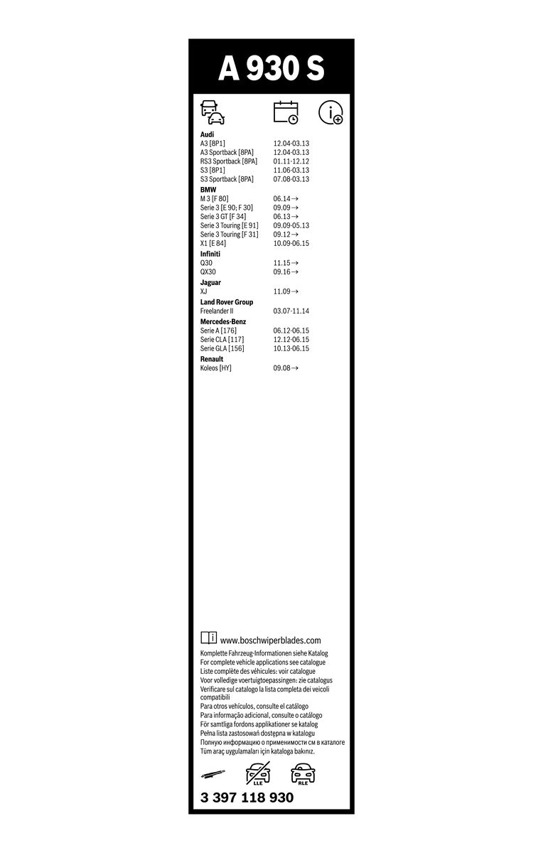 • 1 set of front wiper blades driver side (length: 600 mm) and passenger side (length: 475 mm)