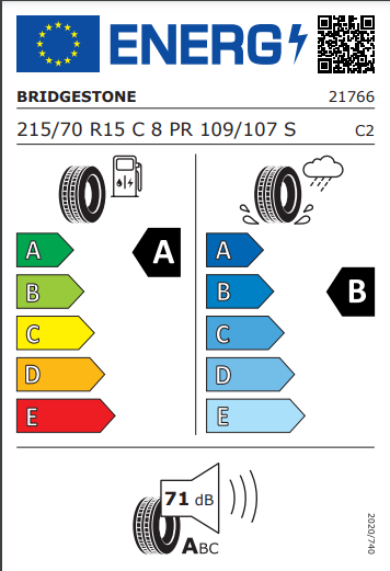 Size - 215/70/15 109S, Fuel Efficiency - A, Noise (dB) - 71, Wet Grip - B, Runflat - No