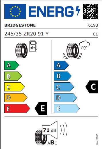 About this tyre - Size - 245/35/20 91Y, Fuel Efficiency - E, Noise (dB) - 71, Wet Grip - C, Runflat - YesAs the only component on your vehicle that actually makes contact with the road surface, tyres are critical for safety when driving.How do you read the markings on a tyre?The markings on a tyre indicate its size, load index and speed rating. A typical tyre marking looks like this - 205/55 R16 W 91. What is the UK legal tyre limit?The minimum tread depth required by law in the UK is 1.6mm. This applies to the central three-quarters of the tyre’s width and its entire circumference. Many car manufacturers, however, advise changing your tyres once the tread is down to 3mm to be on the safe side. What are tyre speed ratings?A tyre speed rating is the maximum speed a particular tyre is legally approved for. The rating is represented by a letter displayed on the tyre sidewall. It will always be the last letter in the sequence.