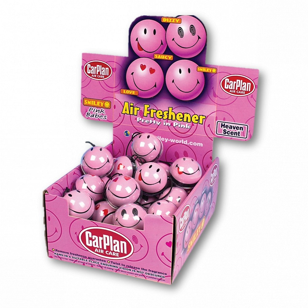 CarPlan Smiley Pink Air Fresheners can hang anywhere freely and have an adjustable Heaven Scented fragrance. Merchandised in a printed CDU for full impact in-store.