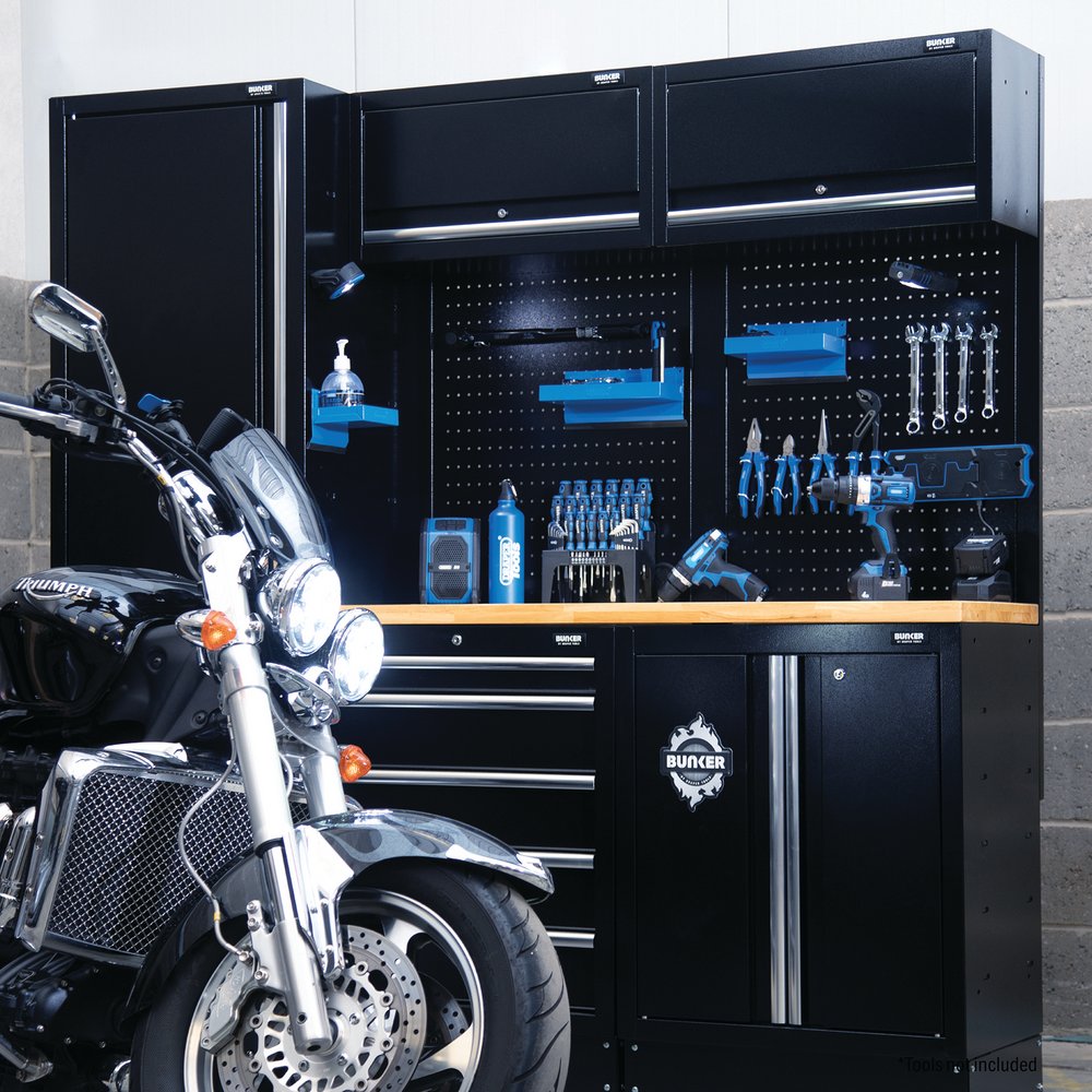 • BUNKER® lets you create a bespoke storage solution — add cabinets, drawers, worktops and accessories tailored to your workshop layout and workflow