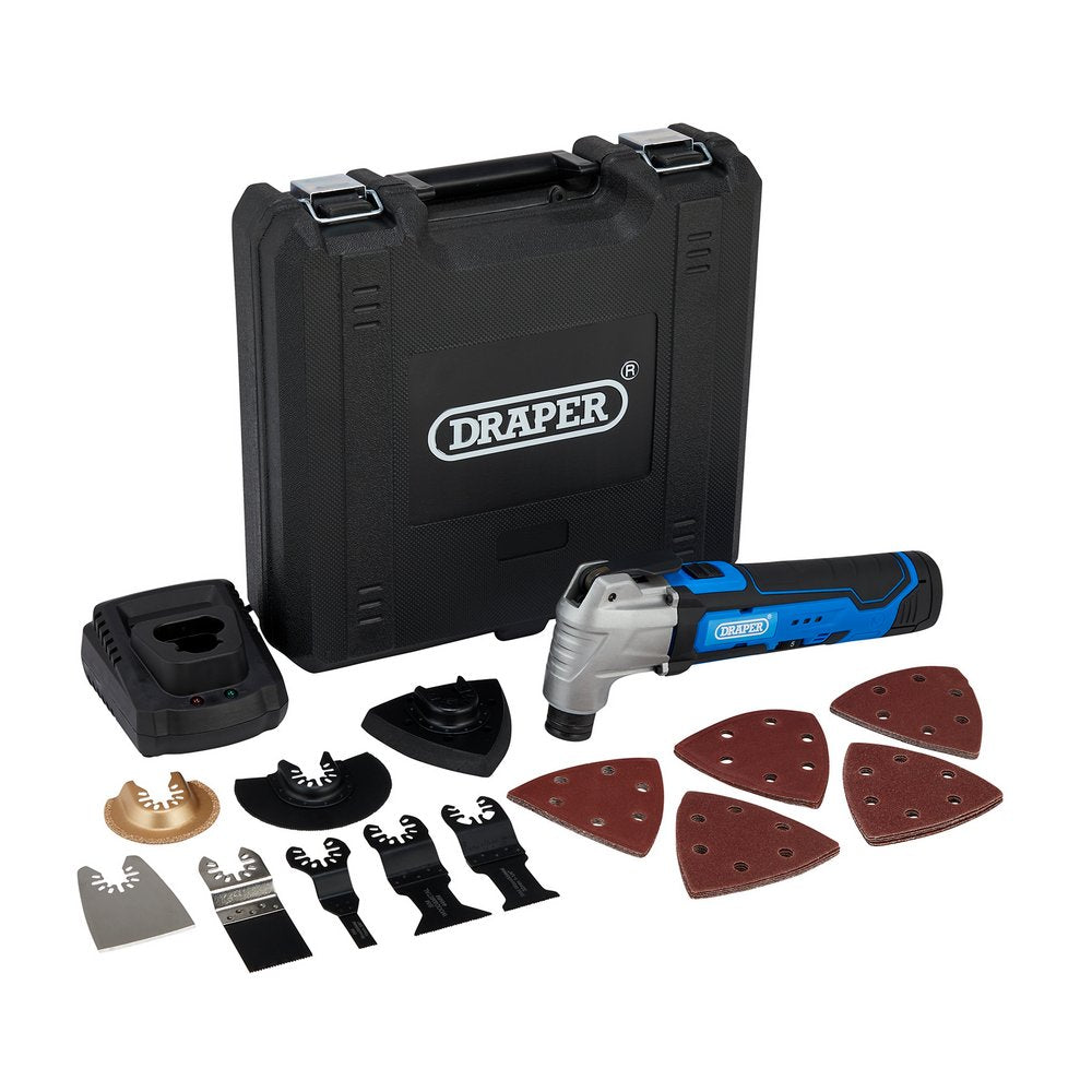 This cordless oscillating multi-tool kit is part of the 12V Power Interchange Series. The multi-tool has has been designed for sawing and cutting wood, plastic, gypsum, plasterboard, non-ferrous metals and fastening elements. It is also intended for work on soft wall tiles, as well as for dry sanding and scraping small surfaces. It is especially good for working close to edges and flush cutting. Lightweight yet versatile, the tool has a quick change blade function, six speed settings and a three° oscillating angle. Featuring an LED worklight, the multi-tool also comes with a number of accessories, including blades, scraper, alloy grinding plate, sanding pad and sanding paper sheets. The kit includes a 1.5Ah battery and 1.5Ah fast charger, and is supplied in a rigid plastic storage case. The multi-tool is part of the Draper Storm Force® 128V interchangeable battery system, which allows users to combine one battery with any of the tools within the 12V series (not compatible with Draper 20V).