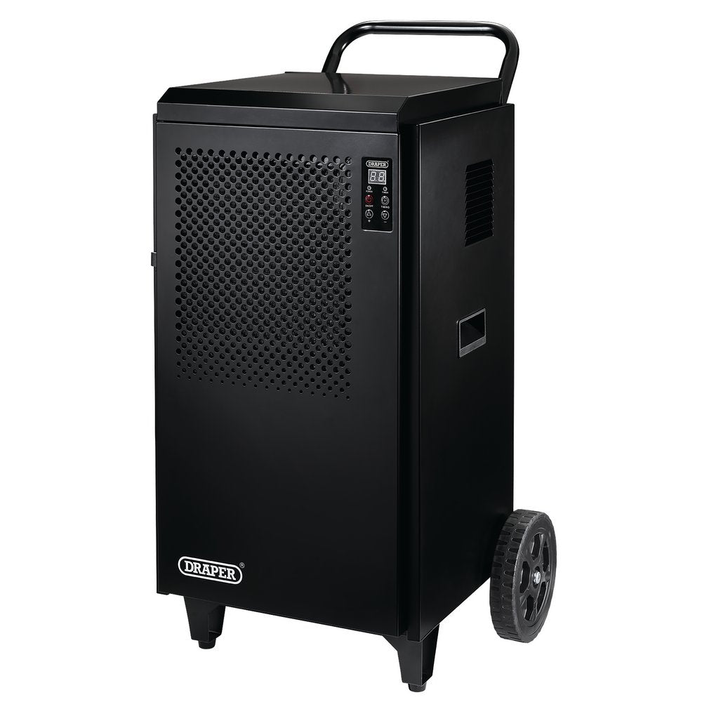 This large portable dehumidifier is capable of extracting up to 70L of moisture from the air per day. It is suitable for large spaces up to 160m2 (minimum size - 14m2) to prevent the build-up of mildrew and mould. It is equipped with a digital control panel and features auto-defrost, auto-reset and 24-hour timer. The air filter is removable and washable for convenient cleaning. Fitted with 90cm long hose for continuous drainage. The steel frame ensures high durability and long service life. Fitted with large wheels and a handle for easy manoeuvrability. Uses refrigerant R290 (propane based).