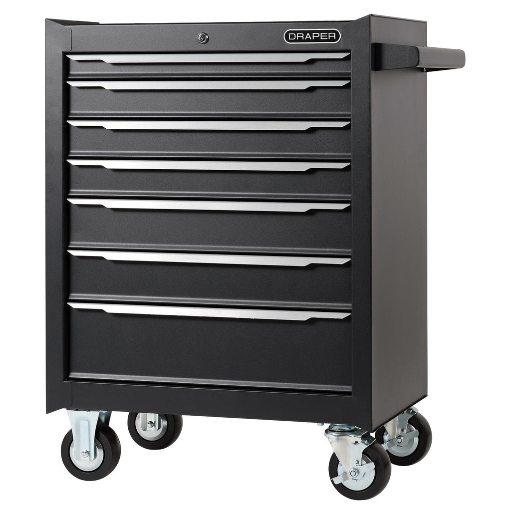 This practical 7-drawer roller tool cabinet is constructed from sheet steel and has a protective powder coated finish that guards against scratches and corrosion. The spacious drawers have a stylish aluminium trim and are equipped with ball bearing sliders for smooth operation and a 2mm EVA liner to protect tools and prevent them from sliding around. The worktop is also lined with EVA for added protection. For easy manouverability, the cabinet includes a sturdy pull handle and is fitted with four large steel castors - two fixed and two swivel with brakes. For security the cabinet has an integral lock to safeguard tools and comes with two keys.