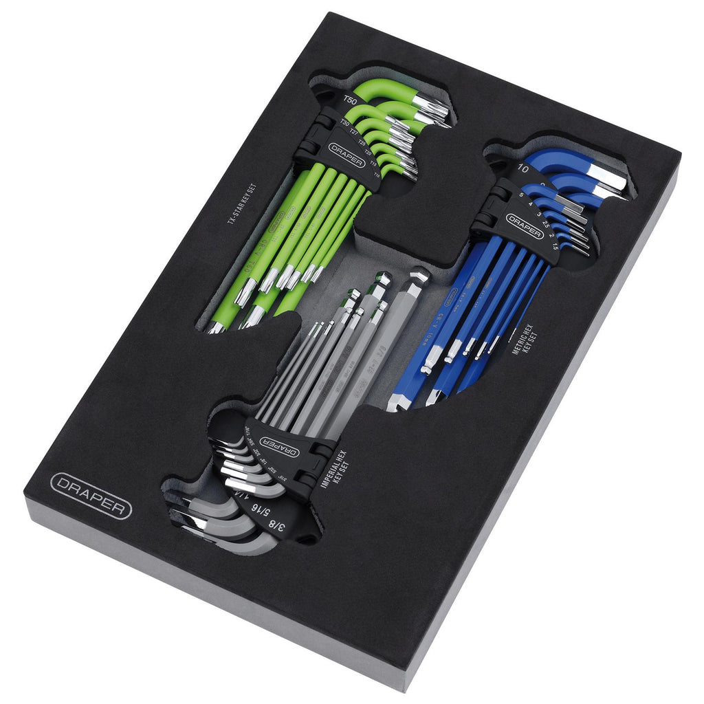 This is a triple set offering a range of metric and imperial ball-end hex keys and Draper TX-STAR® keys. Made from chrome vanadium steel, which has been correctly hardened and tempered for durability. Each has a coloured anti-slip coating for extra control and is plated for corrosion protection. Each set is organised inside an easy release fold-out holder for portability and all three sets are set in an EVA foam tray.