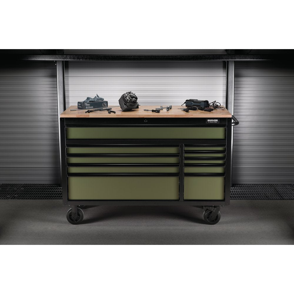 Part of the BUNKER® storage range. This stunningly designed 56" premium-quality steel unit has ten drawers embellished with a stylish black anodised aluminium trim. Each drawer has a smooth soft-close operation and is lined with lush foam to protect your tools. The cabinet’s matt green textured finish is highly durable, thanks to the industrial powder coating that protects against scratches, wear and corrosion. This is a mobile cabinet, allowing you to keep useful items to hand wherever you need them in your garage. The 25mm-thick hardwood worktop spans the whole surface of the unit, providing a handy workspace. For ease of manoeuvrability, there is a steel handle and four durable castor wheels. Two of the wheels are fitted with brakes to keep the tool cabinet still. It has an integral lock for security and is supplied with two keys. The unit requires partial assembly and measures W 1,502 x H 973 x D 622mm. For your quality assurance, all BUNKER® units include a 10-year warranty.Payment & Security