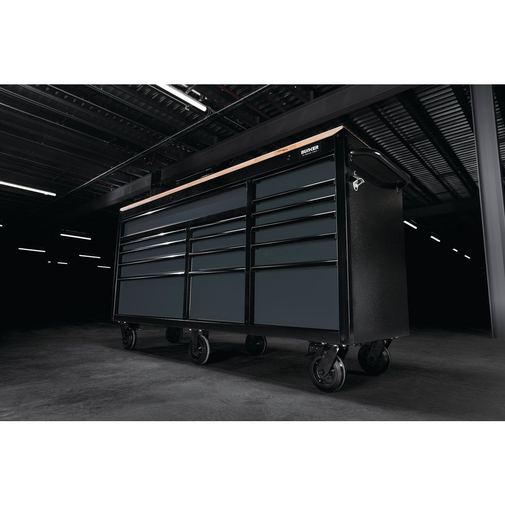 The BUNKER® 72" workbench roller tool cabinet is engineered to perform in demanding environments and provide the ultimate storage solution when you need it most. This roller tool cabinet boasts 15 drawers and is coated with a highly durable matt grey powder finish, accentuated by a sleek black anodised aluminium trim to provide a modern and stylish aesthetic.