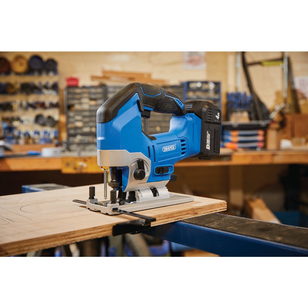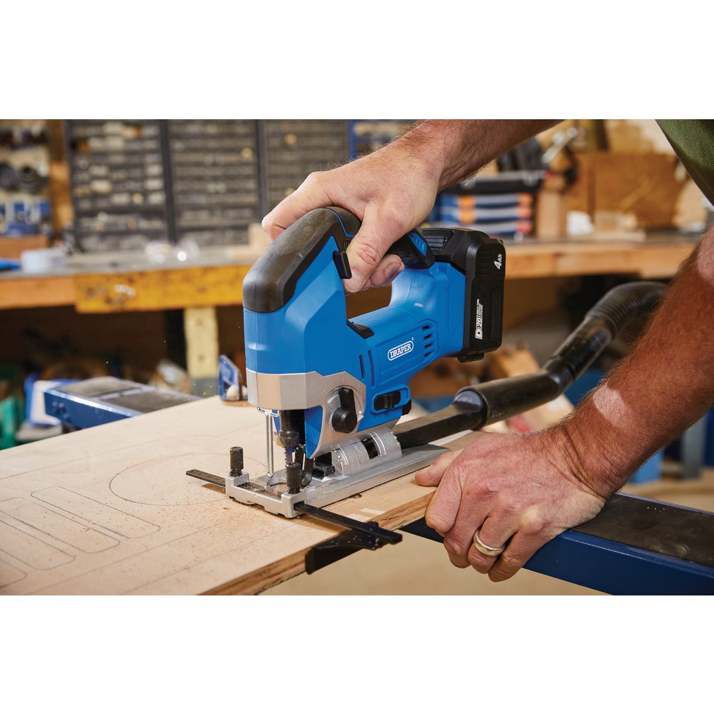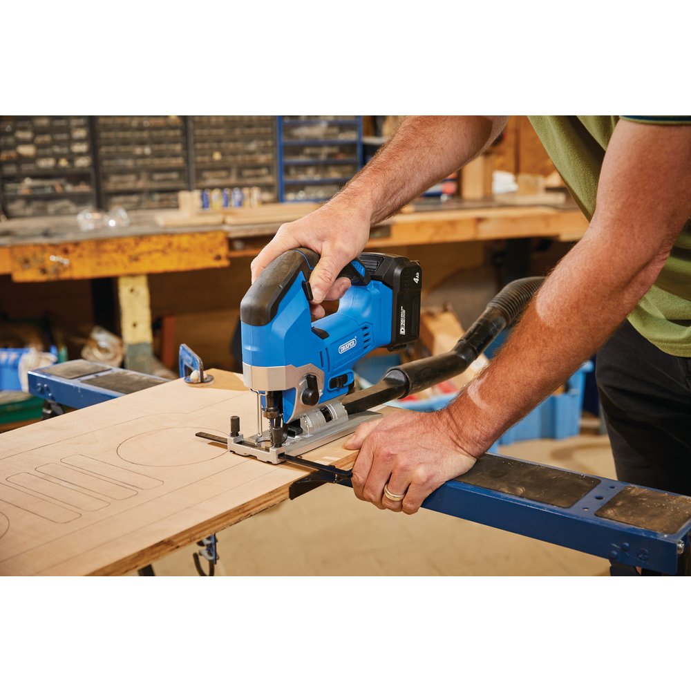 This cordless brushless jigsaw has 4-stage pendulum action and variable speed for increased cutting performance. It is powerful and robust, constructed with a die-cast aluminium base and all-metal gearing. Changing blades is easier due to the quick-release function. It is fitted with an anti-splinter guard, LED worklight and dust extraction outlet. Supplied with two jigsaw blades, parallel guide and dust extraction adaptor. D20 batteries and chargers sold separately. The D20 interchangeable battery system allows you to combine the same battery/batteries with any of the tools within the D20 series.