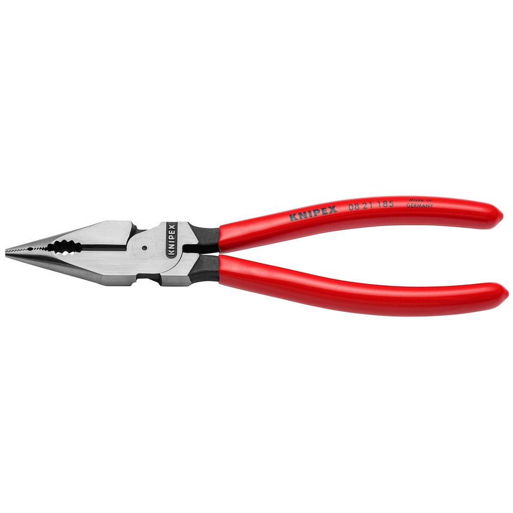 08 21 185 SB Needle-Nose Combination Pliers Powerful combination pliers with pointed jaws. For all common installation and repair work.. handy use when working in confined areas thanks to slim head design and pointed jaws (anti-twist). Milled groove in the gripping area permits small parts such as nails, pins and bolts to be held and pulled. The reliable and diverse combination pliers when out and about. Easy cutting thanks to the high leverage joint. With cutting edges for soft, medium-hard and hard wire. Long service life and stable tips. Cutting edges additionally induction-hardened, cutting edge hardness approx. 64 HRC. - Cutting capacities medium hard wire (diameter): Ø 3.8mm- Cutting capacities hard wire (diameter): Ø 3.0mm- Cutting capacity copper cable, multiple-stranded: Ø 13.0mm- Cutting capacity copper cable, multiple-stranded: 25.0mm²
