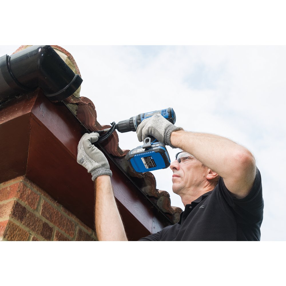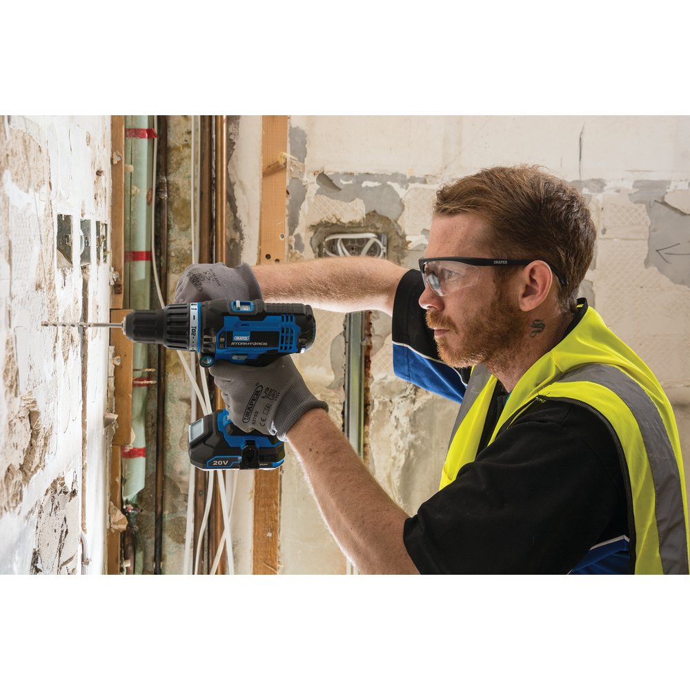 Features: Part of the Draper Storm Force 20V Power Interchange series, 3 functions; Drill, Screwdriver, Hammer, 13mm keyless chuck, Two speed gearbox with 22 torque control positions, Variable speed control with electronic brake, Battery level indicator, Spindle Lock, LED worklight, Supplied with 2x 2Ah batteries and a quick one hour charger. Draper Storm Force® 20V interchangeable battery system allows you to combine one battery with any of the tools within the 20V Storm Force series (not compatible with Draper Storm Force® 10.8V).