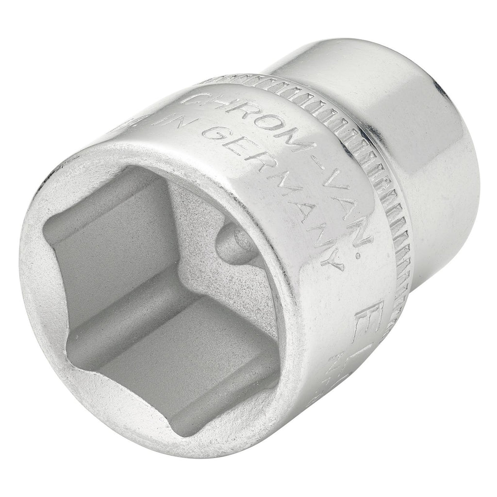 Professional Quality, socket manufactured from chrome vanadium steel hardened, tempered and chrome plated for corrosion protection. Chamfered end allows positive nut location and entry. Hole for driving accessory spring-loaded ball bearing.