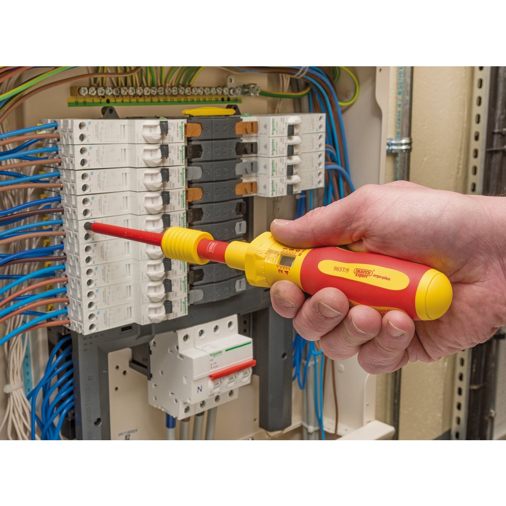 XP1000®, interchangeable VDE torque screwdriver with a selection of popular screwdriver tipped blades for electrical applications. Perfect for torque-controlled tightening of screws, which helps avoid damaging screws and tools while ensuring a safe and secure screw connection. The adjustment scope for the torque screwdriver is 1.0–5.0Nm (accuracy ±6%). The handle and blade sleeve is moulded in two pieces, enabling the blades to be fitted deep into the handle ensuring there's no "flashover". Ergonomic soft grip bi-material handle allows free spinning in the palm of your hand to quickly tighten screws, but also allows transfer of torque when needed. Designed with flat sides to prevent them from rolling. Individually tested to 10,000V, suitable for working on live circuits of 1,000V AC and 1,500V DC. The VDE interchangeable blades are made from SVCM steel for added strength and deliver a fast and easy press-in auto lock action with a simple release method. Supplied complete with calibration certificate, supplied in a convenient canvas roll for secure transportation and storage.